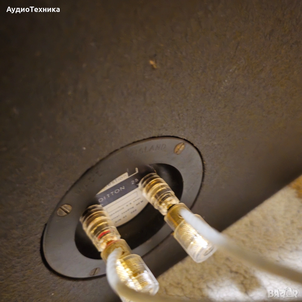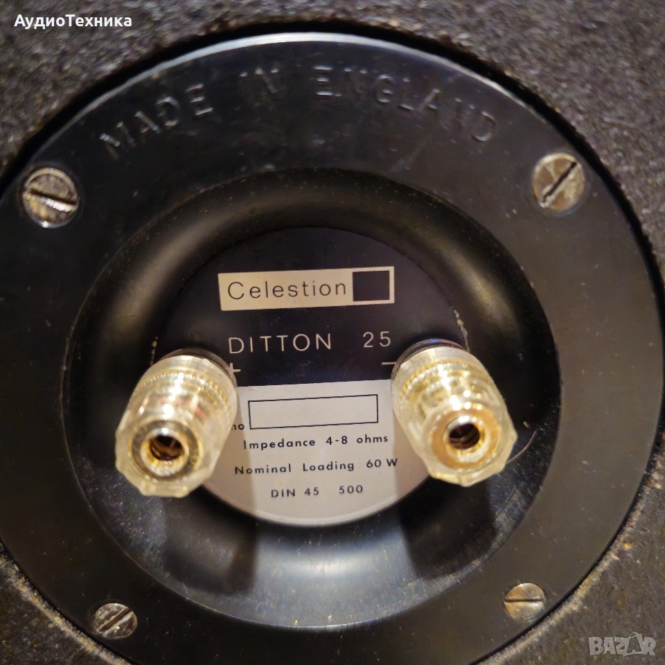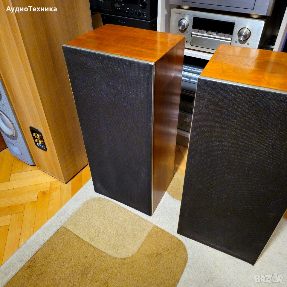 Като цяло тонколоните са в добро състояние и имат прекрасен звук. Естествено имат и сила с 12 инчов нискочестотен говорител(бас) Намират се в Пловдив и може да се видят и чуят на място. Предпочитам лично предаване за Пловдив,защото тежат 44 кг двете. Мога да ги пратя по куриер, но след предварително плащане по банков път. Сложени са качествени позлатени терминали. Предлагам отделно и качествени кабели на QED. Модела е правен от 1970 до 1979 като има от 20 до 60 вата номинална мощност. Тези са 60. • Manufacturer: Rola Celestion LTD • Model: Ditton 25 • Years of construction: 1970 - 1979 • Made in: Ipswich Suffolk, Made in England • Colour: Wooden case natural walnut, teak • Dimensions (WxHxD): 360 x 820 x 290 mm • Weight: 22 kg/44 kg • New price approx.: 1'100 DM Technical data • Design: 3-way, closed • Chassis: • Woofer: 300 mm cone/12 • Passive membrane: 300 mm ABR Passive Bass Radiator • Midrange: 2x 38 mm dome (HF-1300) • Tweeter: 35 mm dome (HD-2000) • Load capacity (nominal/pulse): 60 W / 120 W • Efficiency: 90 dB at 2.9 W and 1 m • Frequency response: 20 - 40,000 Hz • Crossover frequencies: 2'000 Hz, 9'000 Hz • Impedance: 4 - 8 Ohm