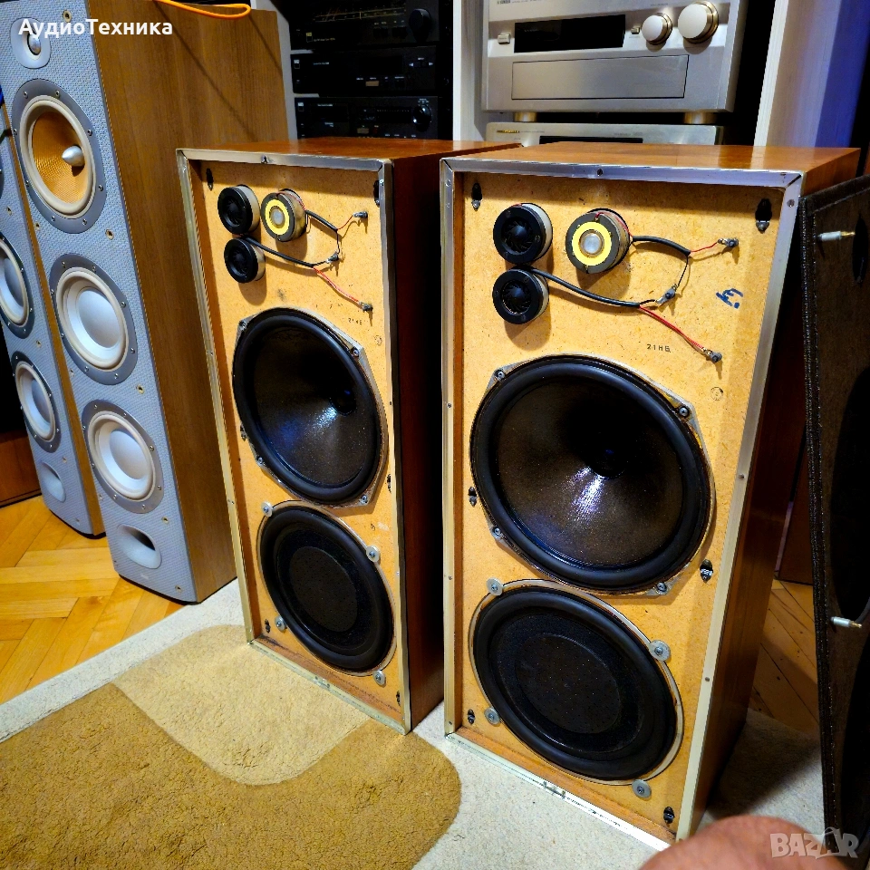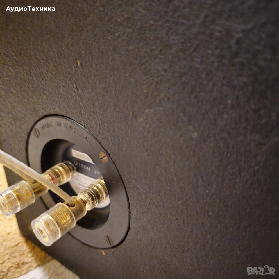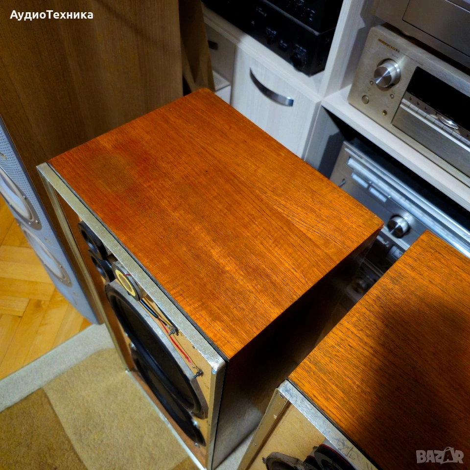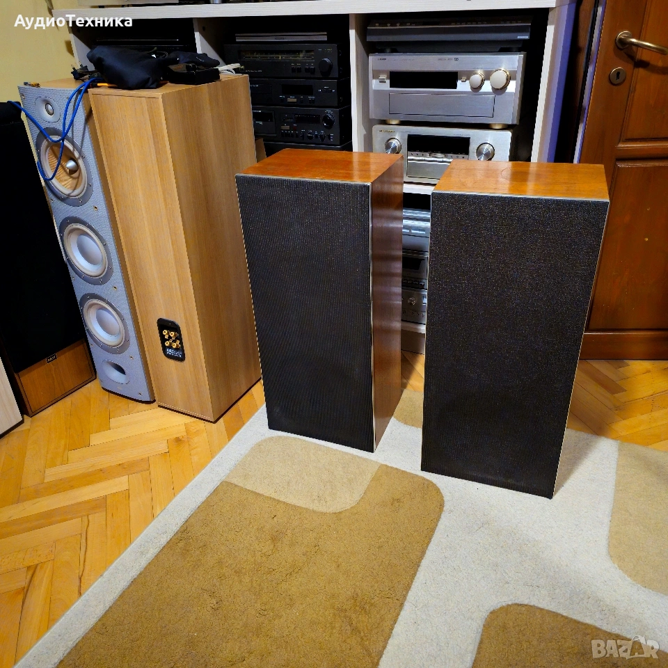 Като цяло тонколоните са в добро състояние и имат прекрасен звук. Естествено имат и сила с 12 инчов нискочестотен говорител(бас) Намират се в Пловдив и може да се видят и чуят на място. Предпочитам лично предаване за Пловдив,защото тежат 44 кг двете. Мога да ги пратя по куриер, но след предварително плащане по банков път. Сложени са качествени позлатени терминали. Предлагам отделно и качествени кабели на QED. Модела е правен от 1970 до 1979 като има от 20 до 60 вата номинална мощност. Тези са 60. • Manufacturer: Rola Celestion LTD • Model: Ditton 25 • Years of construction: 1970 - 1979 • Made in: Ipswich Suffolk, Made in England • Colour: Wooden case natural walnut, teak • Dimensions (WxHxD): 360 x 820 x 290 mm • Weight: 22 kg/44 kg • New price approx.: 1'100 DM Technical data • Design: 3-way, closed • Chassis: • Woofer: 300 mm cone/12 • Passive membrane: 300 mm ABR Passive Bass Radiator • Midrange: 2x 38 mm dome (HF-1300) • Tweeter: 35 mm dome (HD-2000) • Load capacity (nominal/pulse): 60 W / 120 W • Efficiency: 90 dB at 2.9 W and 1 m • Frequency response: 20 - 40,000 Hz • Crossover frequencies: 2'000 Hz, 9'000 Hz • Impedance: 4 - 8 Ohm