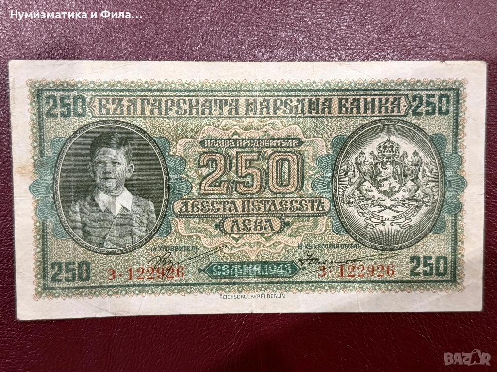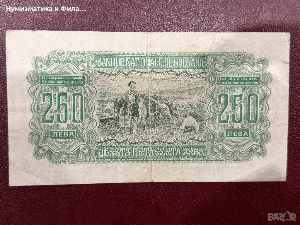 Продавам стара българска банкнота от 250 лева, емисия 1943 година.