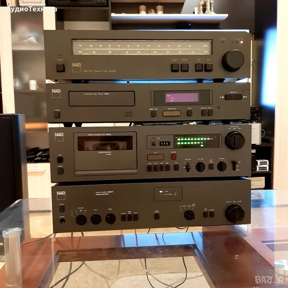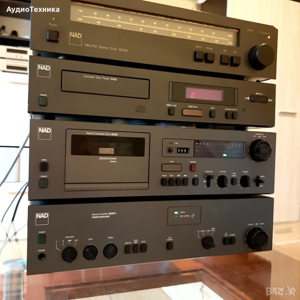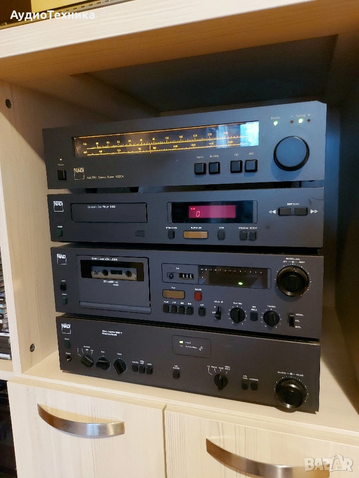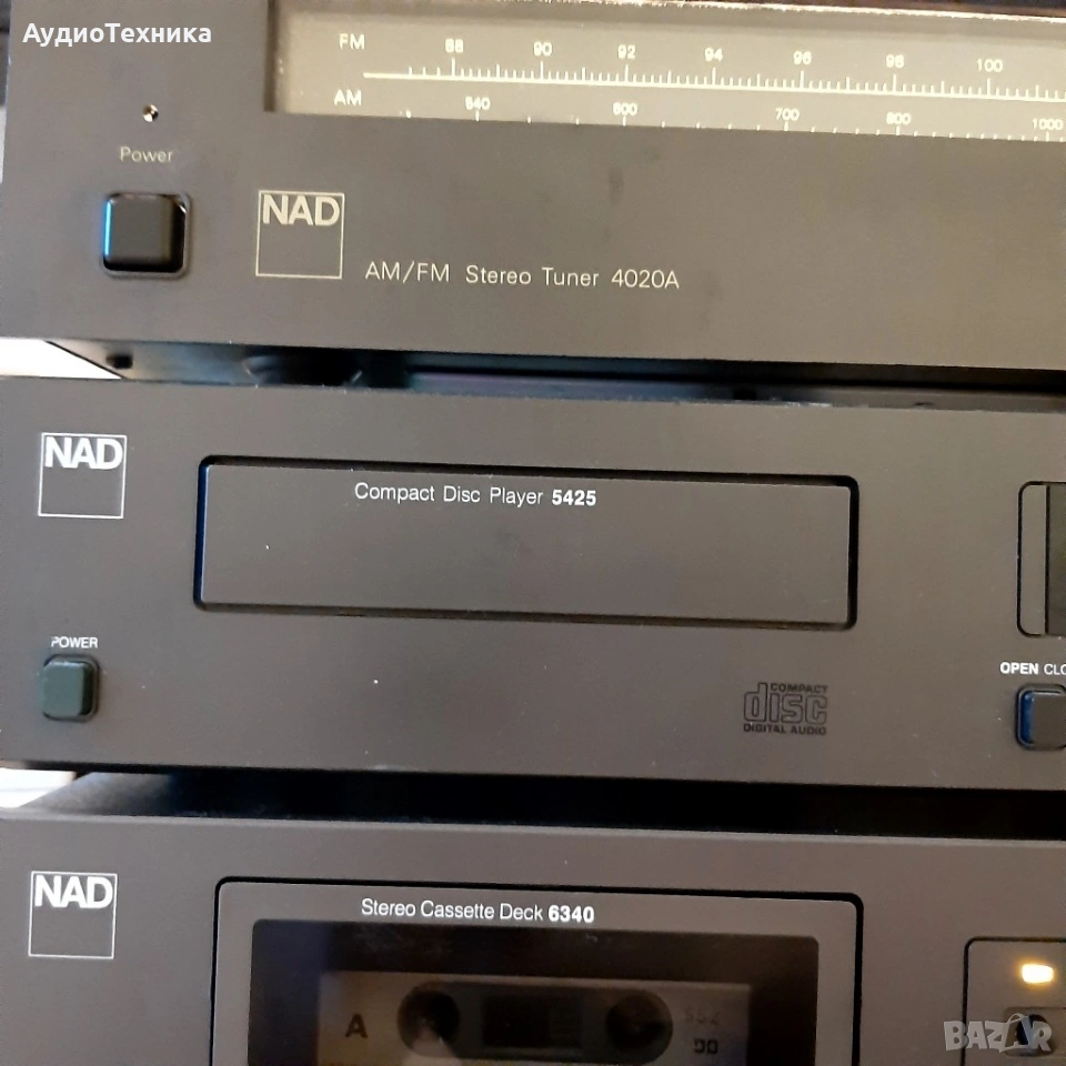 Всичко е минало профилактика Дека е ревизиран изцяло,нови ремъци и т.н Тунера също е ревизиран Усилвателя почистен Плейъра чете каквото му сложиш/почистен. Дадени са над 300 лв за ревизията им,така че цената е крайна! Който не му харесва цената, моля да подминава. Тая система дълго време няма да има нужда от каквато и да е профилактика. Предпочитам лично предаване за Пловдив. ПРАЩАМ САМО СРЕЩУ КАПАРО! NAD 4020A е рационално проектиран тунер с умерени цени, чиято производителност на повечето места и с повечето излъчвания е звуково идентична с тази на много по-скъпи и сложни тунери. Спецификации Тип: моно / стерео тунер Настройка на обхвати: FM, MW Скала за настройка: аналогова Обхват на FM настройка: 88 до 108 MHz Чувствителност: 1.9uV (FM), 250uV (MW) Съотношение сигнал / шум: 70 dB (FM) Изкривяване: 0,3% (FM) Селективност: 65 dB (FM), 30 dB (MW) Честотна характеристика: 30Hz до 15kHz (FM) Размери: 420 х 96 х 240 мм Тегло: 4,2 кг Описание Плейър с фиксиран изход с LCD дисплей за намалено изкривяване, повторение и програмирано възпроизвеждане. Спецификации Формат на диска: CD Цифров преобразувател: MN6471M, MASH 18-bit, 4 x oversampling CD механизъм: KSS-210A Честотна характеристика: 5Hz до 20kHz Динамичен обхват: 98dB Съотношение сигнал / шум: 110dB Разделяне на канали: 80dB Общо хармонично изкривяване: 0,0025% Линеен изход: 2V Размери: 420 х 90 х 260 мм Тегло: 4,1 Спецификации Дек Тип: 2 глави, единична компактна касета Track System: 4-пистова, 2-канална стерео Скорост на лентата: 4,75 см / сек Глави: 1 x запис / възпроизвеждане, 1 x изтриване Тип лента: тип I, CrO2, метал Намаляване на шума: B, C Разширение за главата: HX Pro Честотен отговор: 35Hz до 18kHz (метална лента) Съотношение сигнал / шум: 70 dB (dolby C) трептене: 0,05% Общо хармонично изкривяване: 1,2% Вход: 40mV (линия) Изход: 0.5V (линия) Размери: 420 х 271 х 122 мм Тегло: 4,5 кг NAD 3240PE Спецификации Работи на 4 и на 8 ома Изходна мощност: 40 вата на канал в 8Ω (стерео) Честотна характеристика: 20Hz до 20kHz Общо хармонично изкривяване: 0,03% Фактор на затихване: 50 Входна чувствителност: 3.5mV (MM), 160mV (линия) Съотношение сигнал / шум: 76dB (MM), 102dB (линия) Размери: 420 x 108 x 380 мм Тегло: 6.7кг