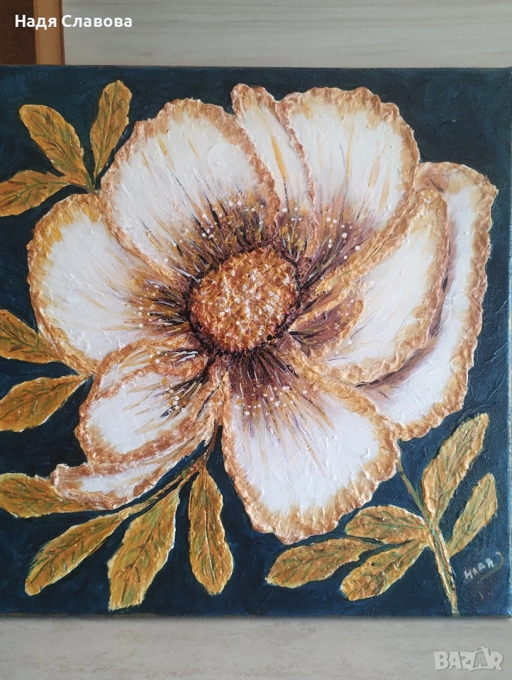 Картината е със структурна паста, акрил ,платно с под рамка размер,40/40. готова за окачване.