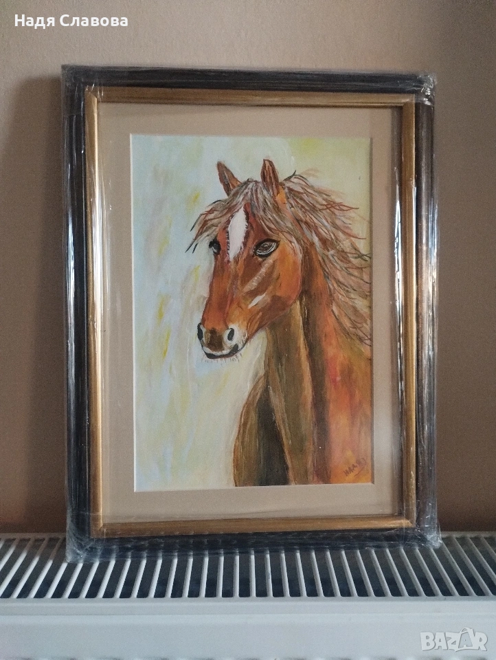 Картината е рисувана с акрил,картон рамкирана и защитена с антирифлекстно стъкло,37/45..