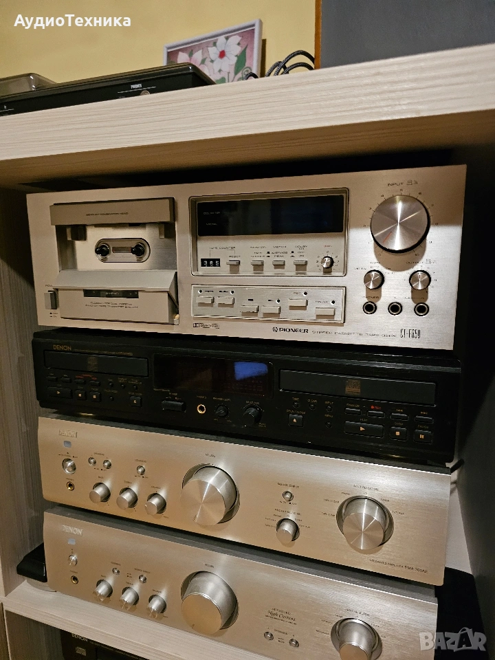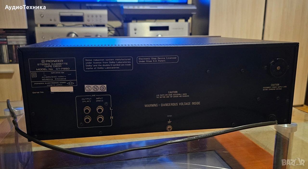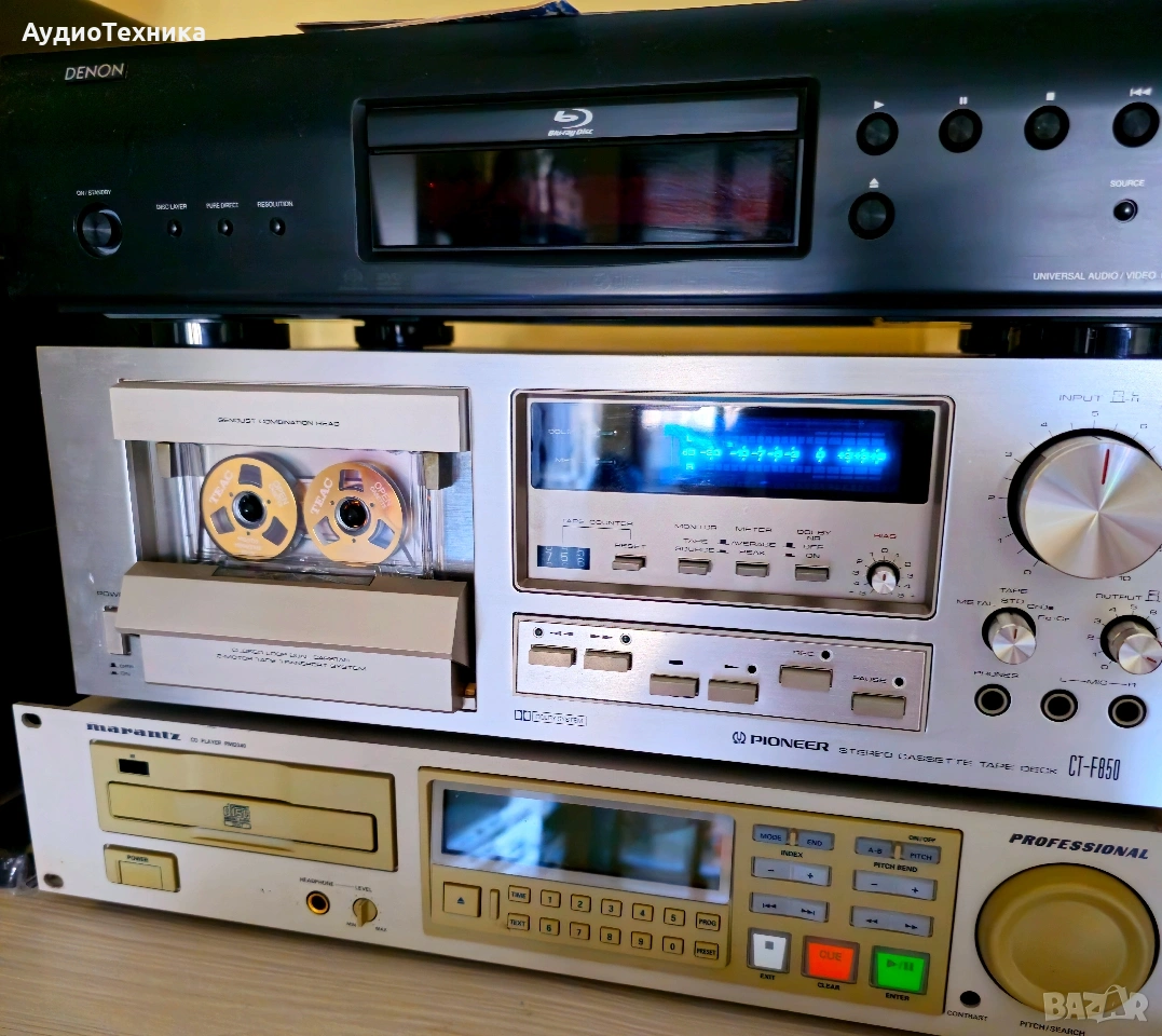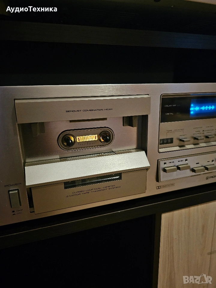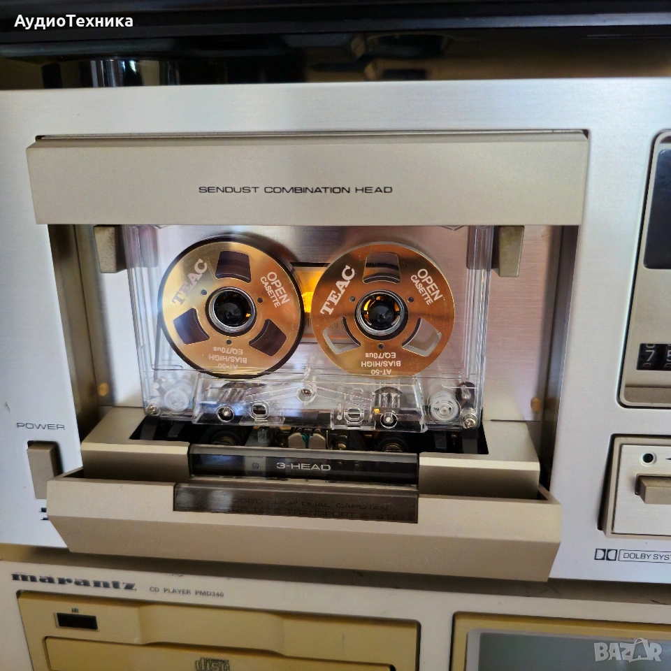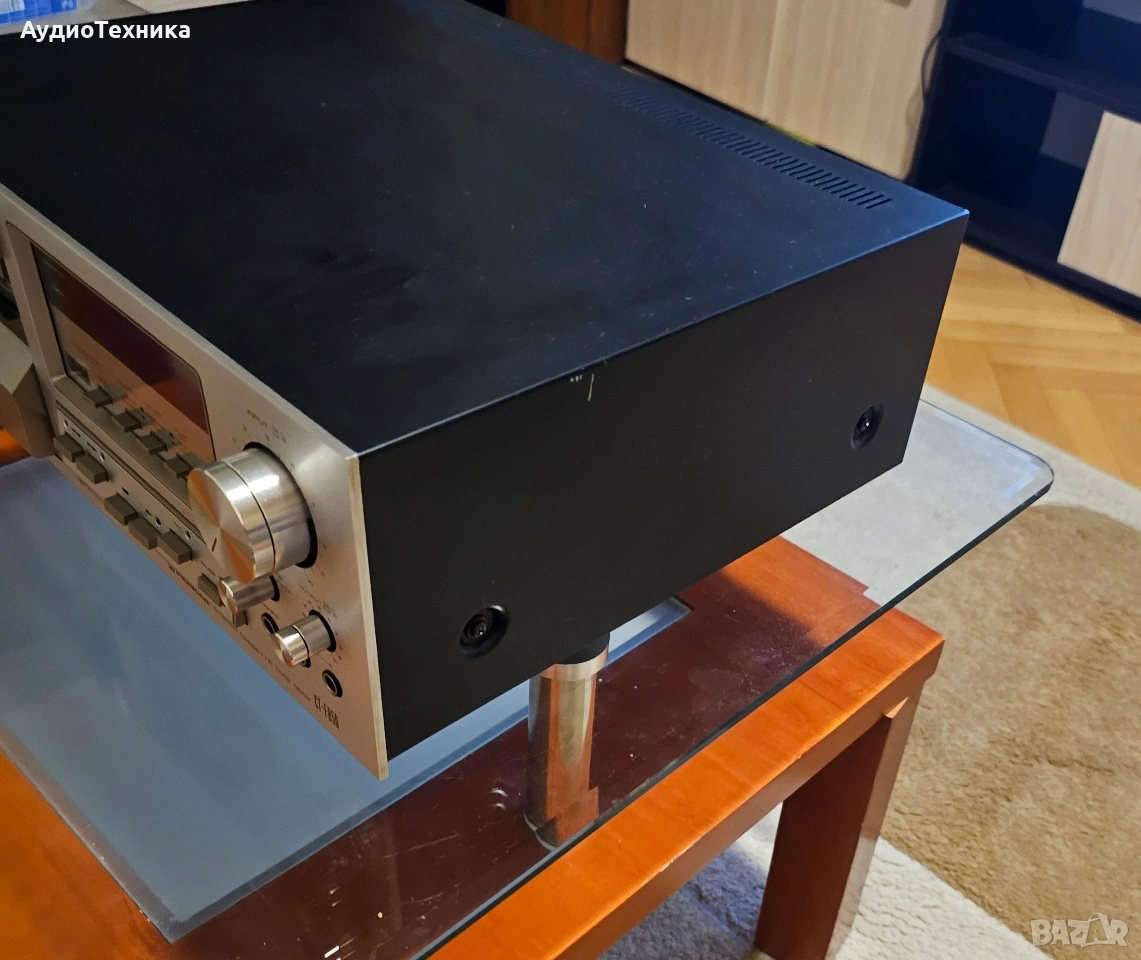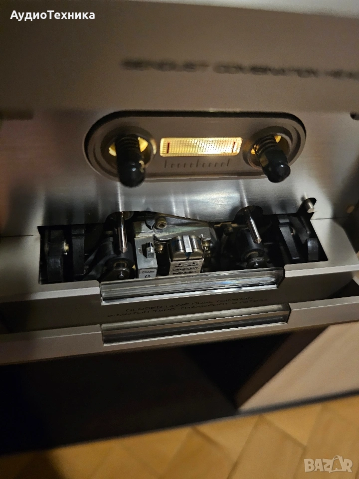 Дека е в много добро състояние. Пълно обслужване,ремъци и т.н. Триглав и двумоторен касетен дек. Предпочитам лично предаване за Пловдив или пращам срещу капаро. Compact cassette, 2-hannel stereo Capstan drive, DC servo Motor x 1 Reel drive: DC high torque motor x 1 Heads: 3 Sendust Recording/Playback Wow and Flutter: 0,04% (WRMS) Standard, LH tapes: 20 to 17,00 Hz Ferrichrome tape: 20 to 18,000 Hz Chromium dioxide tape : 20 to 18,000 Hz Metal tape : 20 to 19,000 Hz Signal-to-Noise Ratio: Dolby NR Off : more than 59 dB Dolby NR On : more than 69 dB Dolby NR system (ON-OFF) with LED indicator lamp Power Requirements: AC 120, 220, 240 V (switchable)50/60 Hz Power Consumption: 45 watts or 50 watts Dimensions (W x H x D): 420 x 150 x 361 mm Weight: 9,5 kg Price: 500$ Year: 1979