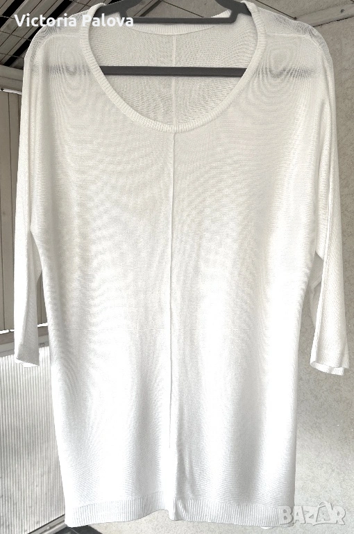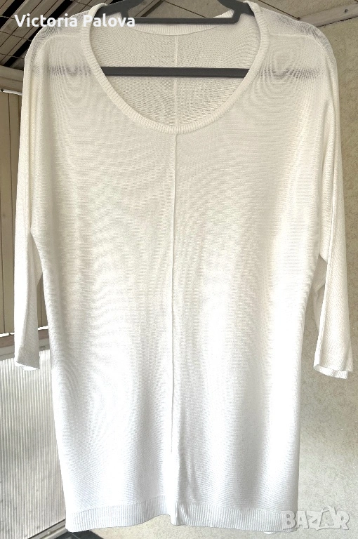 Лек и изключително мек пуловер от гладка вискоза с фин, елегантен прозрачен ефект. Моделът е с модерно паднало рамо без шев, красива кръгла яка и удобни три-четвърти ръкави, които придават свободна и стилна линия.
