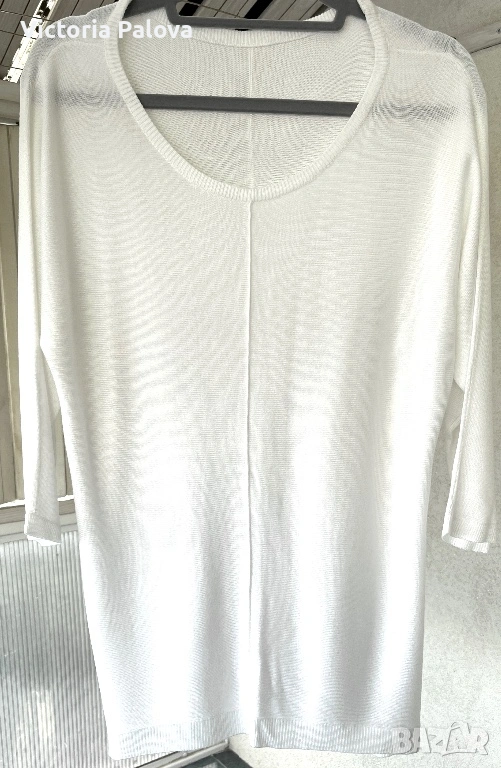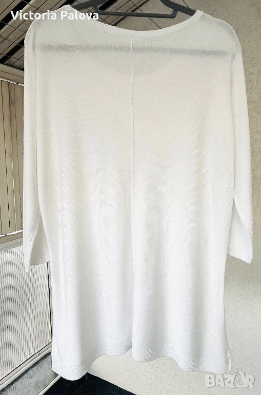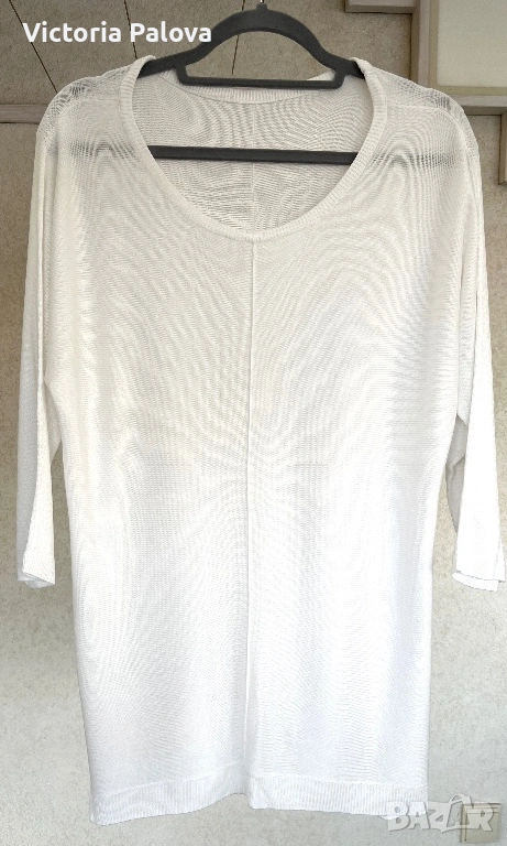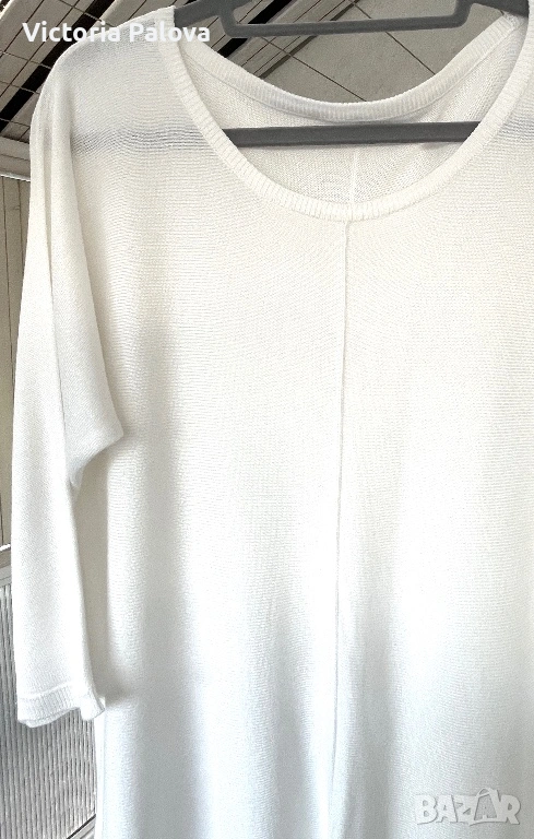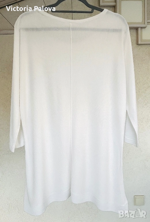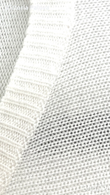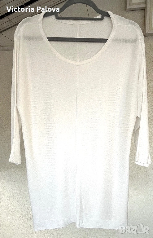 Гръдна обиколка 56 см, дължина 72 см, ръкав от мишница 32 см. Цвят бял с нежен кремав нюанс.