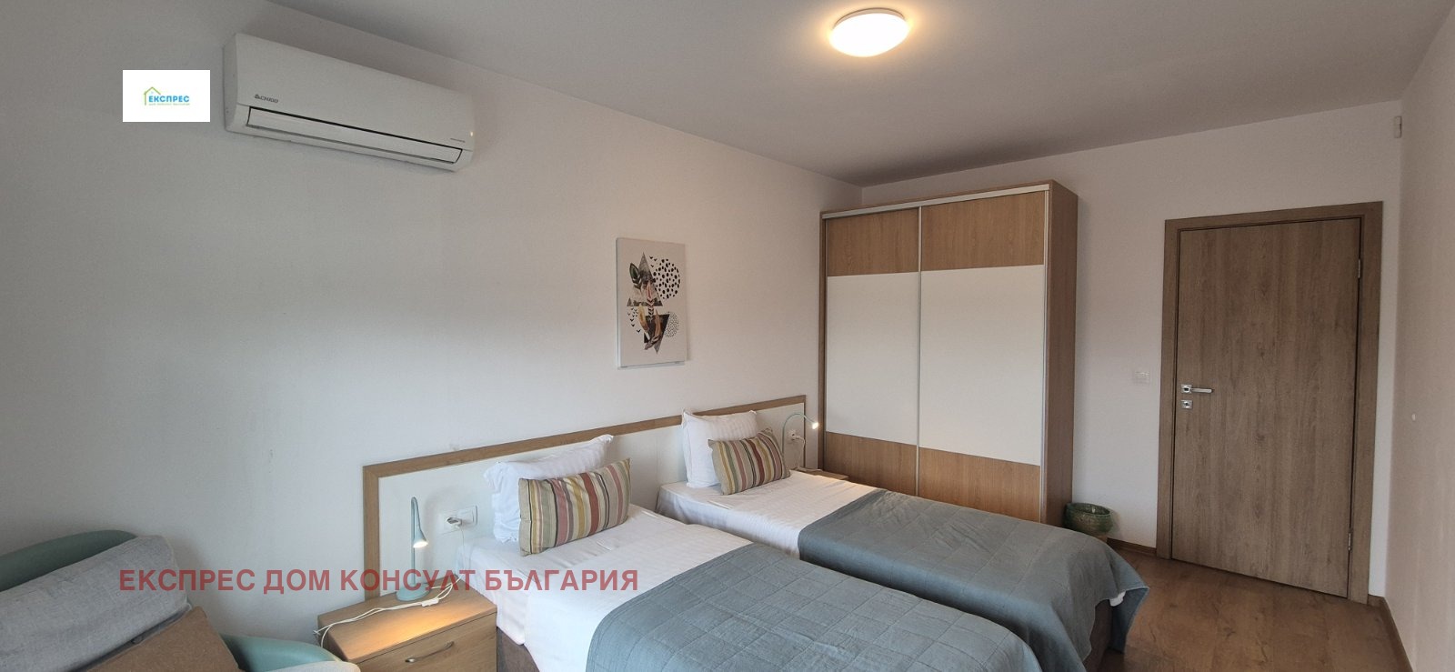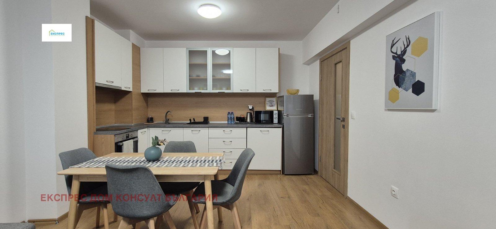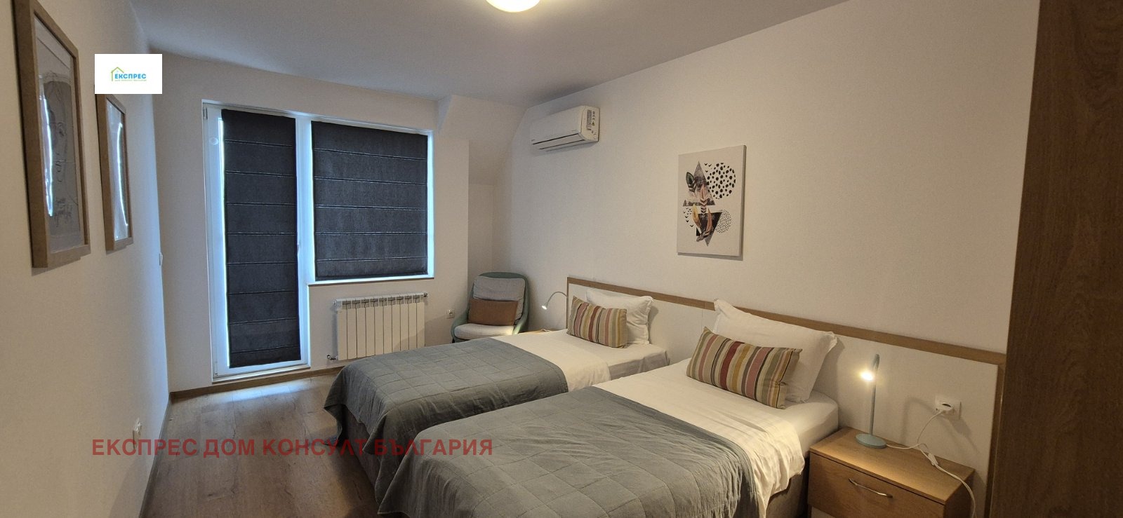 Агенция за недвижими имоти Експрес Дом Консулт България предлага на вашето внимание нов, слънчев, просторен тристаен апартамент на изключително комуникативно място в близост до метростанция, множество спирки на градския транспорт, училища, детски градини,бизнес и административни сгради. Разпределение: входно антре, хол с кухненски бокс и трапезария, две спални, баня с тоалетна, тоалетна за гости, складово помещение, два балкона. Имотът се отдава напълно обзаведен. Кухня с вградени маркови електроуреди, инверторни климатици от висок клас в двете спални. Настилки ламинат, гранитогрес, стени: латекс. Апартаментът се намира в нова тухлена кооперация с контрол на достъпа и луксозни общи части. Възможност за наемане на паркомясто срещу 100 евро. ИМОТЪТ Е СВОБОДЕН ОТ 09.05.2026!!! Предимства: до метростанция, училища, бизнес и административни сгради, магазини, хипермаркети. Ниски консумативни разходи и много други екстри.