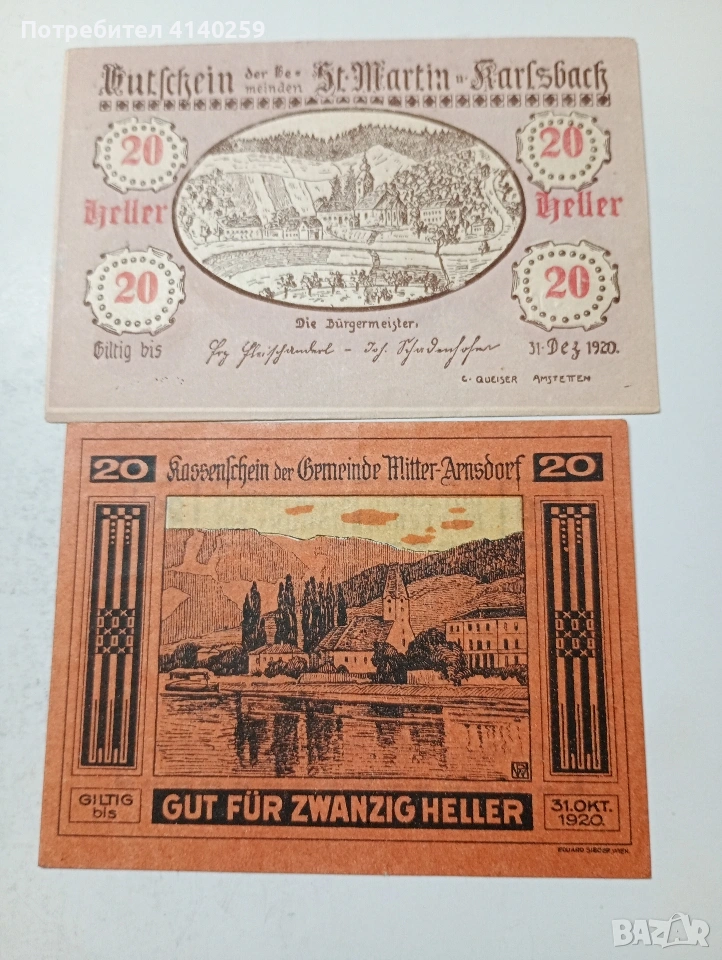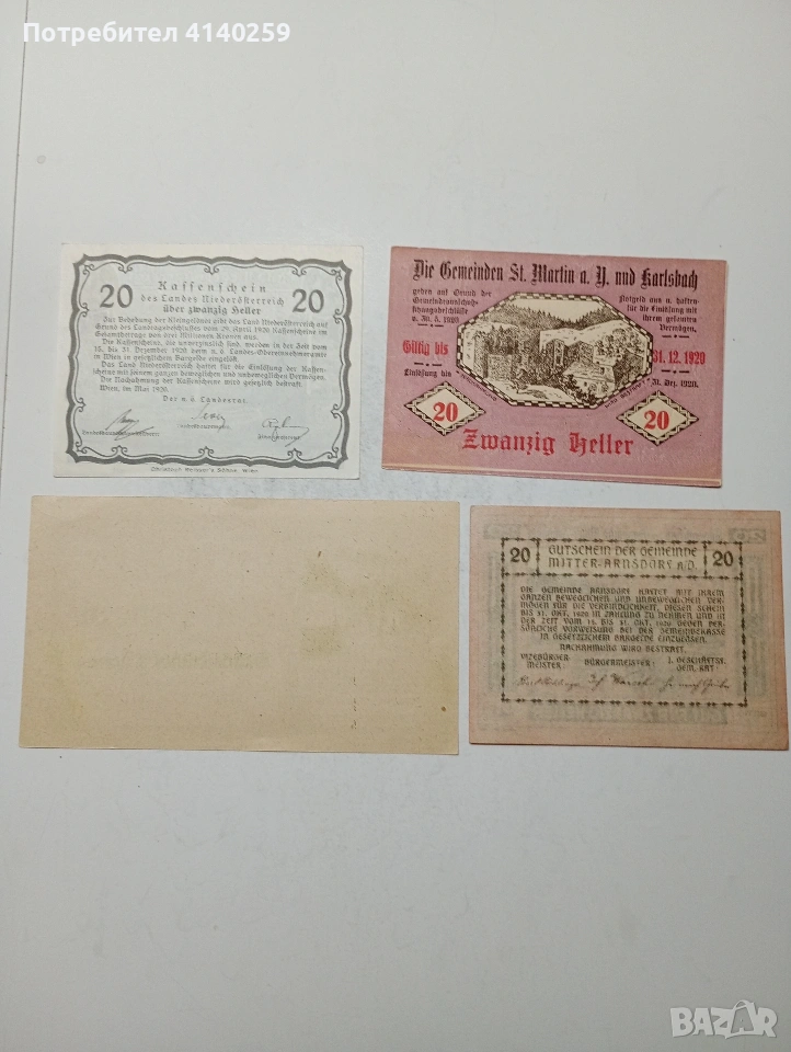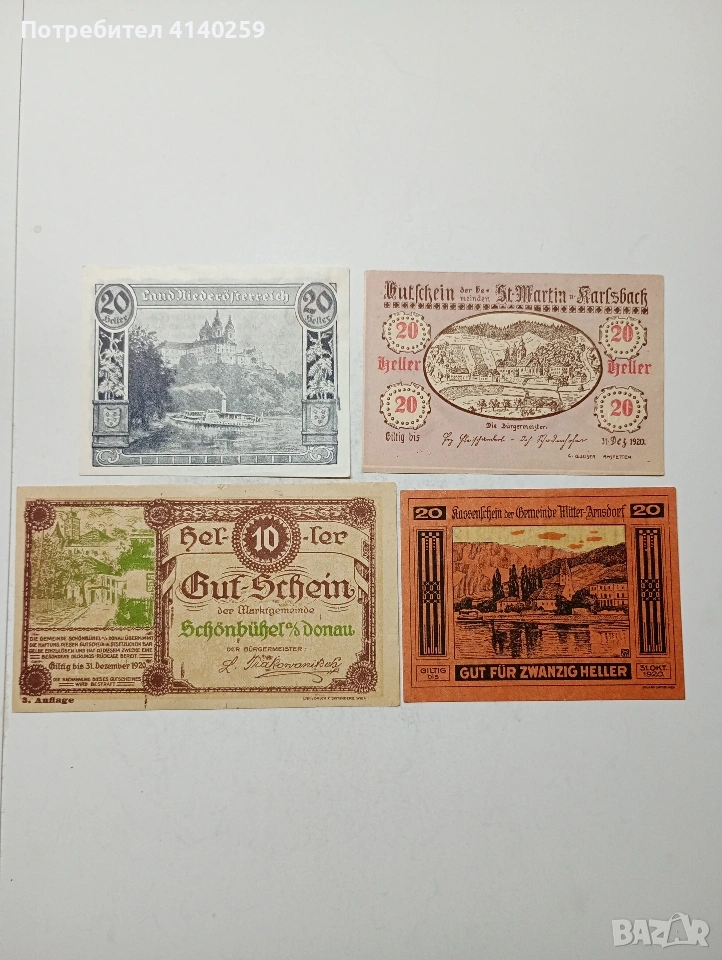 АВСТРИЯ БАНКНОТИ ТИП НОТ ГЕЛ СПЕШНИ ПАРИ 10 ХЕЛЕРА 1920 Г ГРАД ШЬОНБЮЕЛ 20 ХЕЛЕРА 1920 Г МИТЕРАРНСДОРОН 20 ХЕЛЕРА 1920 Г ГРАД КАРЛЕБАХ 20 ХЕЛЕРА АВСТРИЯ 1920 Г СЪСТОЯНИЕ НОВО ЦЕНА ЗА 4 БРОЯ ПОЛУЧАВАТЕ СНИМАНИТЕ БАНКНОТИ РАЗГЛЕДАЙТЕ ДРУГИТЕ МИ ОБЯВИ ДА КОМБИНИРАТЕ ДОСТАВКА ЕКОНТ ЗА ВАРНА ЛИЧНО