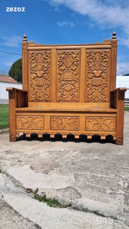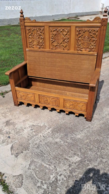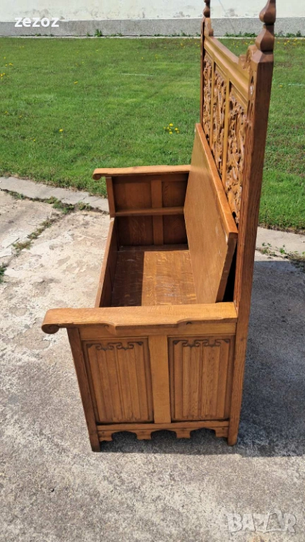 Ретро пейка изработена от масив в стил "Готическо възраждане".Висока облегалка,разделена на панели с хералдически мотиви и флорални орнаменти характерни за готическия стил.Пейката е с ракла-място за сядане и за съхранение.Конструктивно здрава и запазена.Размери-