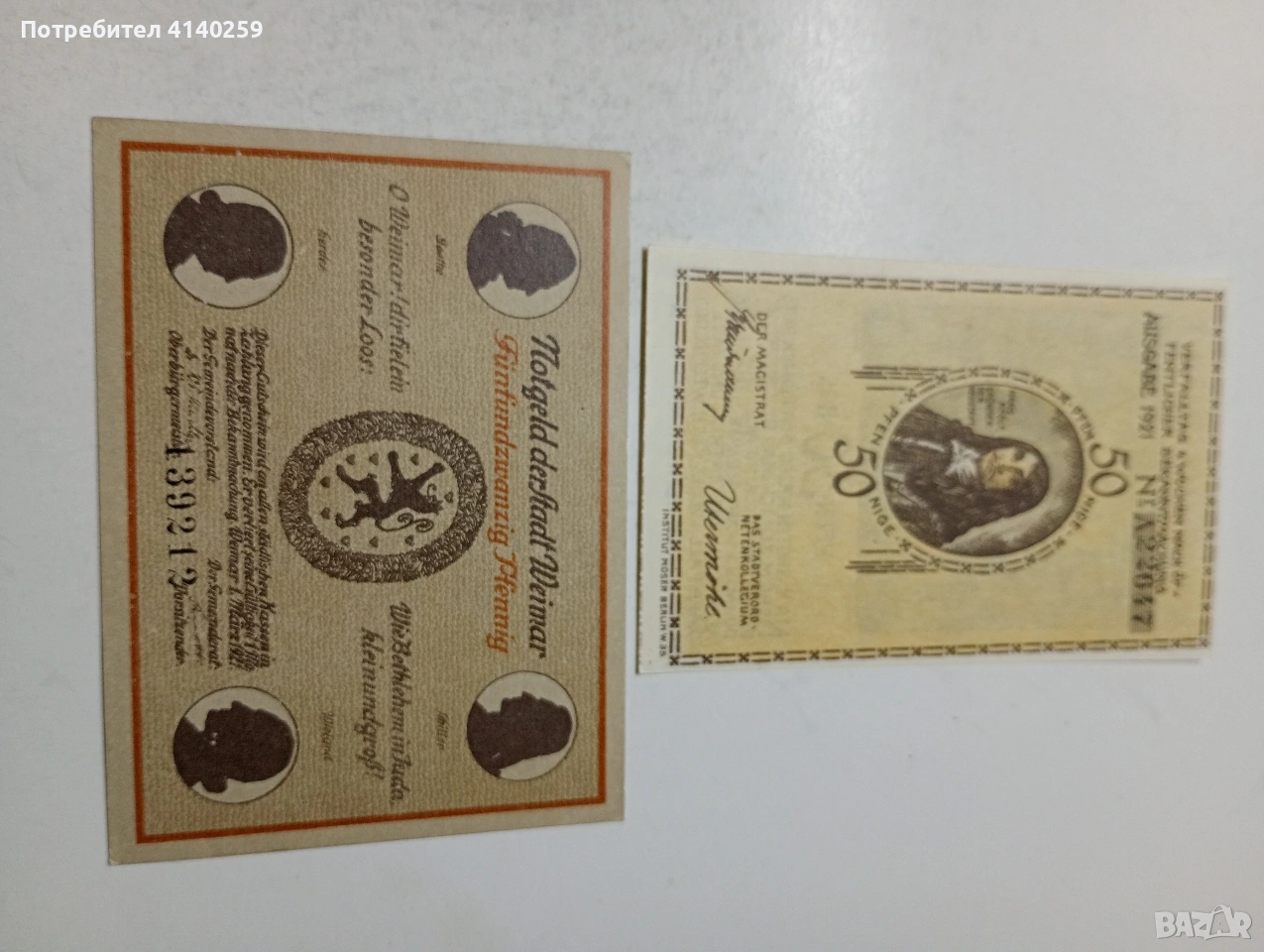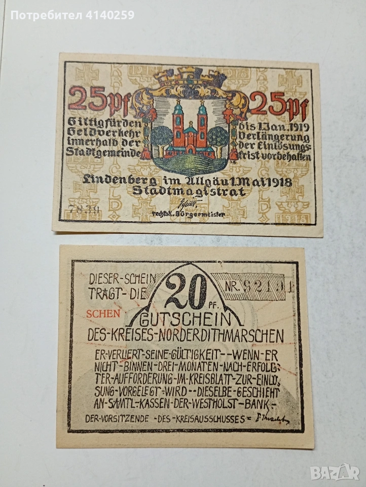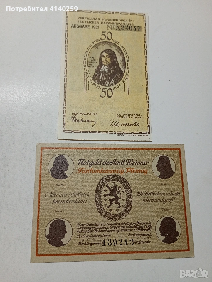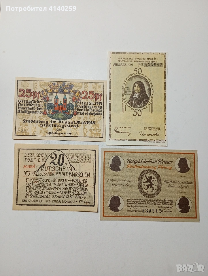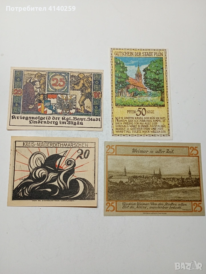 ГЕРМАНИЯ БАНКНОТИ ТИП НОТ ГЕЛ СПЕШНИ ПАРИ 50 ПФЕНИГА ГРАД ПЛЬОН 1921 Г 25 ПФЕНИГА ГРАД ЛИНДЕНБЕРГ 1918 Г 20 ПФЕНИГА ГРАД НОРДЕРДИТМАРШЕН 1920-1921 Г 25 ПФЕНИГА ГРАД ВАЙМАР 1921 Г СЪСТОЯНИЕ НОВО ЦЕНА ЗА 4 БРОЯ ПОЛУЧАВАТЕ СНИМАНИТЕ БАНКНОТИ РАЗГЛЕДАЙТЕ ДРУГИТЕ МИ ОБЯВИ ДА КОМБИНИРАТЕ ДОСТАВКА ЕКОНТ ЗА ВАРНА ЛИЧНО