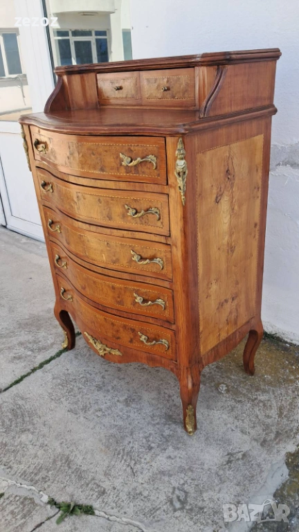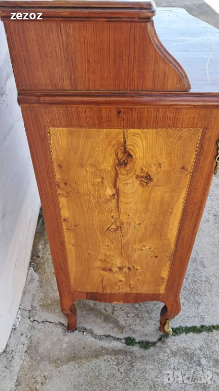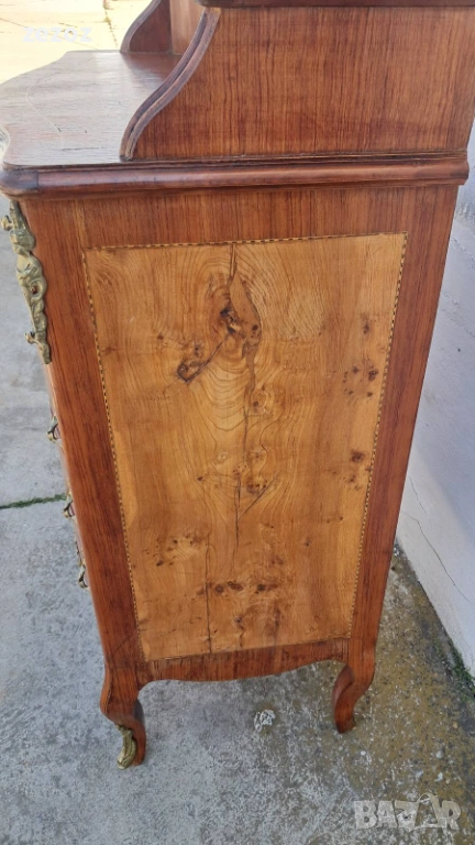 Френски ретро класически скрин,изработен от масив в стил Луи 15.Извитите крака и богатите месингови орнаменти по ъглите,дръжките и крачетата са типични за класическия барок от 18 век.Интарзия от различни видове дървесина,създаващи сложни декоративни шарки.Страничните панели са оформени с фурнир разтворен като"книга" за се покаже красотата на материала.За годините си е конструктивно здрав,но си носи патина от времето,като стари поправки по фурнира и др.Размери-