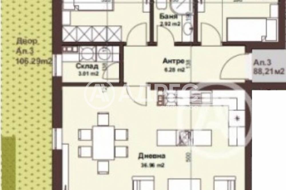 Тристаен непреходен апартамент, състоящ се от входно антре, голяма дневна с кухненски бокс, две спални, едната от които със собствена баня с тоалетна, баня с тоалетна, складово помещение. Застроена площ от 88.21 кв.м. Жилището е с прилежащ двор от 106.29 кв.м. На етажа са три апартамента, благодарение на което жилището е с изложения. В цената е включено и открито паркомясто с площ от 11.25 кв.м.