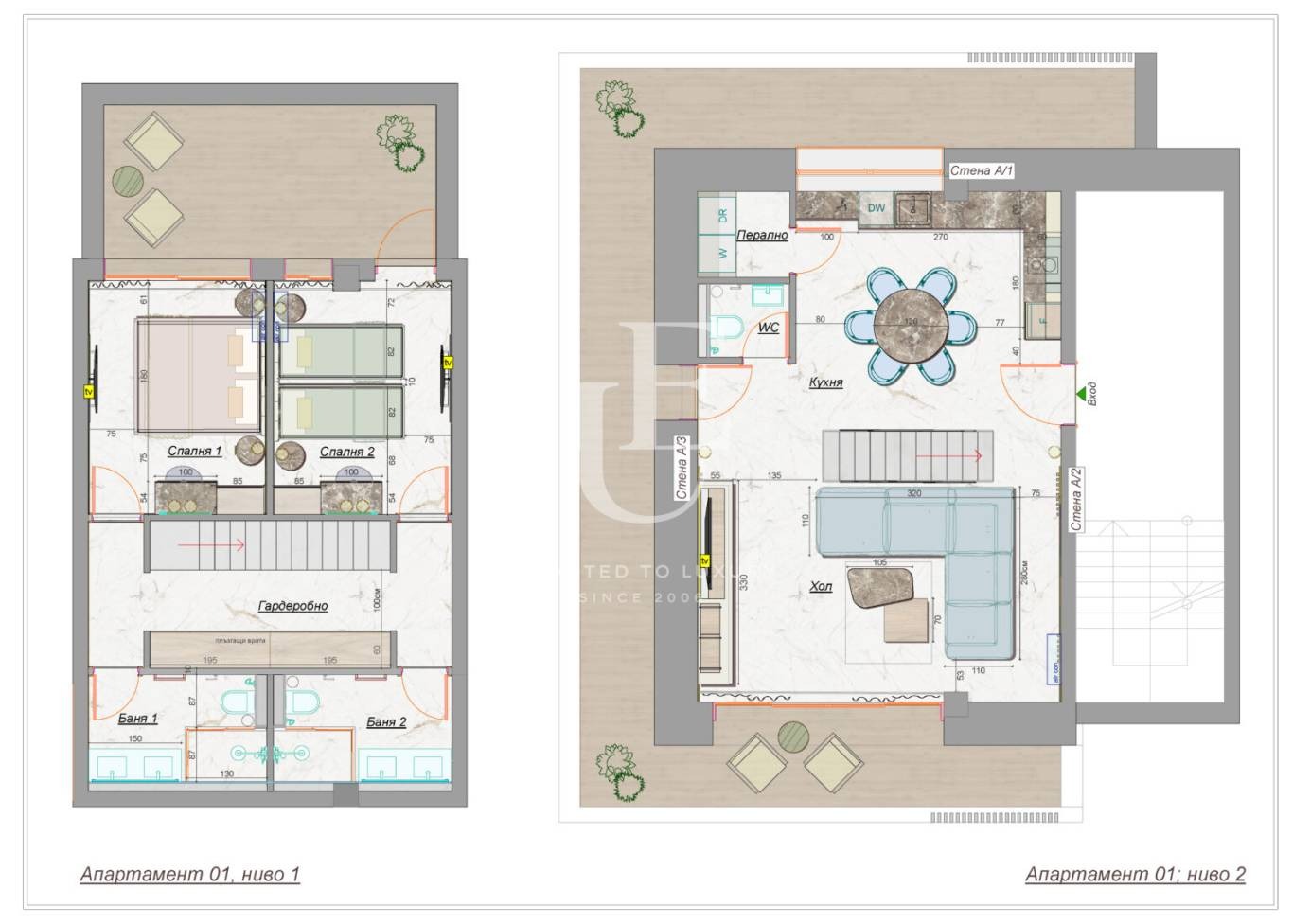 На първо ниво: светъл дневен тракт с отворена кухня, трапезария и директен излаз към верандата и басейна; баня/тоалетна; място за килер/пералня. На второ ниво: спални със собствени бани и тоалетни и излаз към веранда Ref. ID:29412