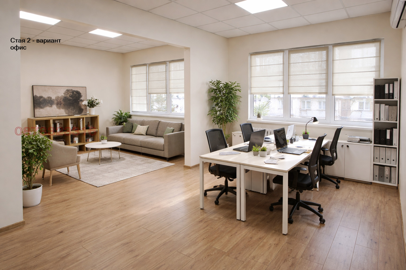 Офис готовност: Изградено окабеляване за 10-12 работни места и обособено сървърно помещение. Идеален за ИТ офис, кантора, учебен център и др. Партерен етаж.