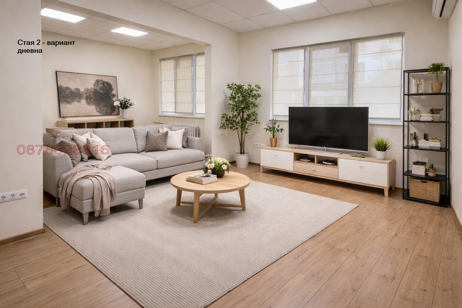 Стилен интериор с декоративни акценти и зеленина, създаващи уютна атмосфера.
