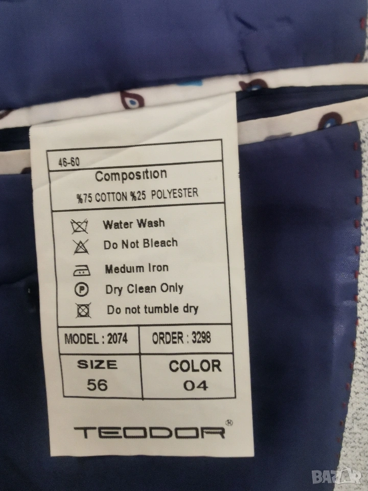 Мъжко сако на Teodor обличано по повод, сакото няма забележки. Дължина от рамото до долу 76 см. Ширина от мишница до мишница около 60 измерено едностранно цената е 49 E