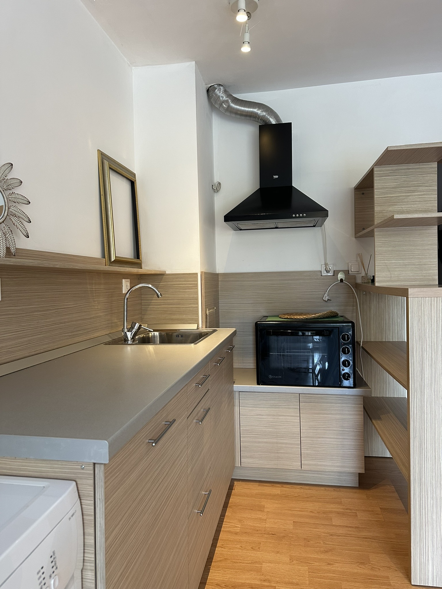 - голяма стая със спалня и хол, кът за хранене и кухненски бокс - оборудван с бяла техника;