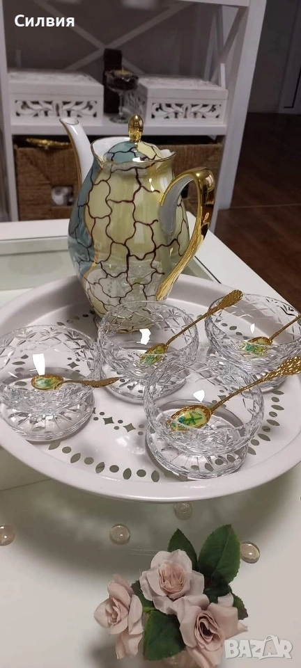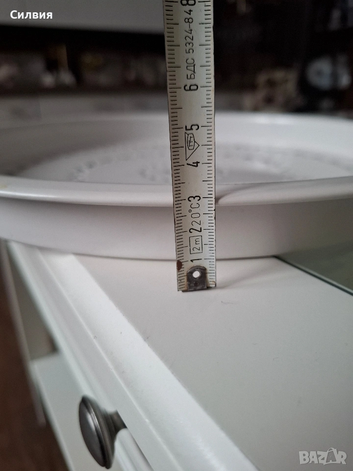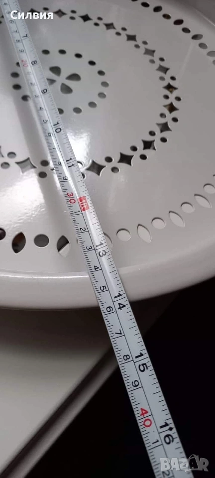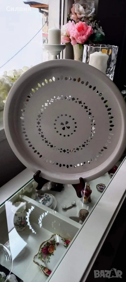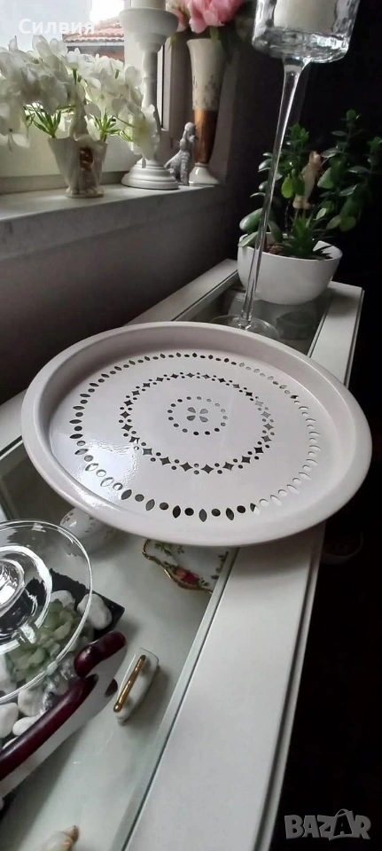 Метална Табла с Ажурни Детайли – Винтидж Полъх Идеалното допълнение за ценителите на винтидж атмосфера и детайлите с характер. Материал: Висококачествен метал с устойчиво емайлирано покритие. Дизайн: Красива ажурна декорация с концентрични орнаменти, които придават ефирност и елегантност. Размери: Впечатляващ диаметър от 36 см, подходящ както за сервиране, така и за декоративна акцентна подложка. Състояние: Отлично съхранена. Тази табла е перфектната сцена за вашия следобеден чай, за поднасяне на десерти в кристални купички или като стилна основа за свещи и цветя. Тя превръща всяко сервиране в специален ритуал, напомнящ за спокойствието на класическите европейски домове. Цена 2️⃣0️⃣€ 39,12лв