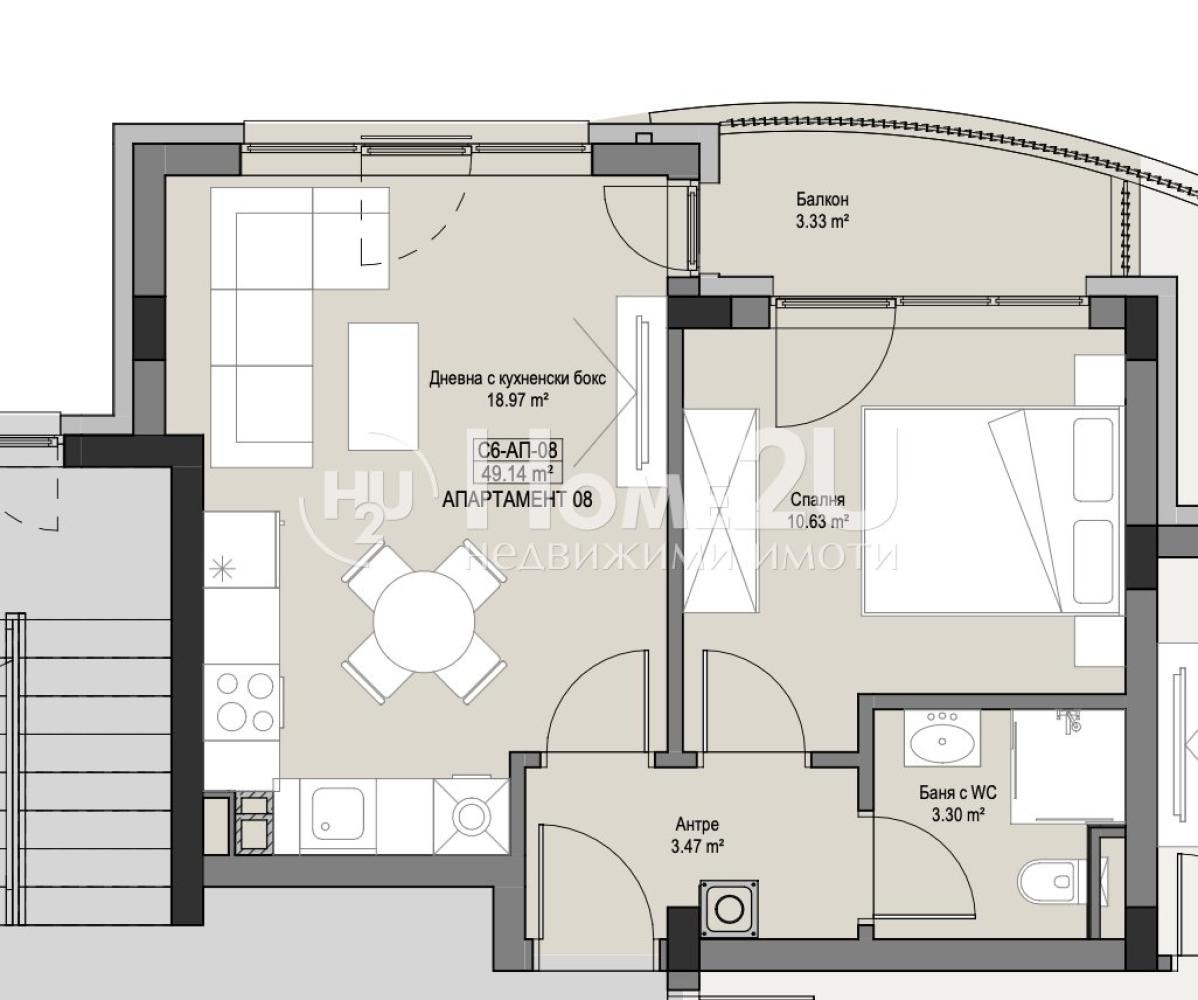 Жилището е с функционално разпределение, както следва: дневна с кухненски бокс, спалня, баня с тоалетна, антре и балкон.