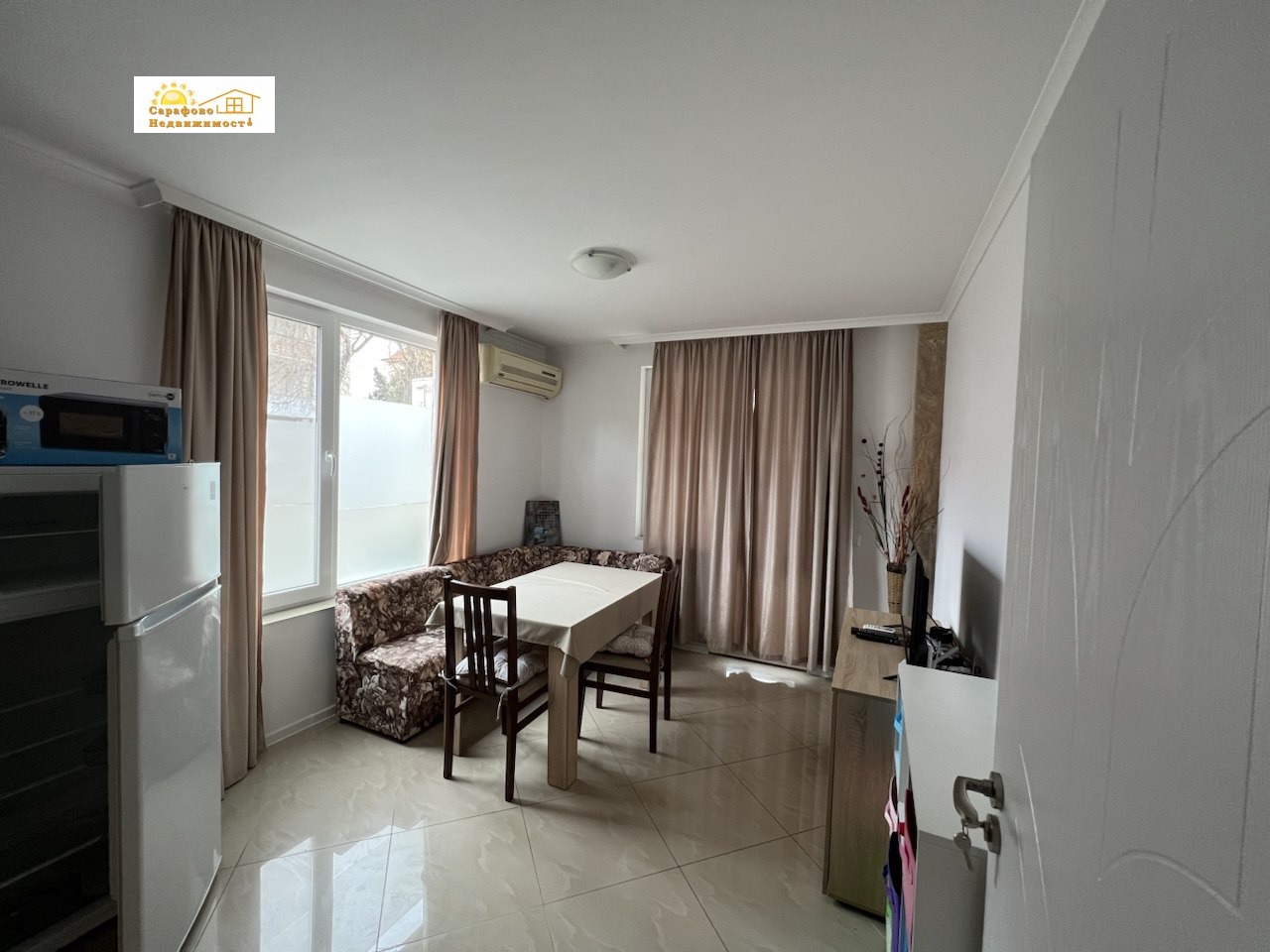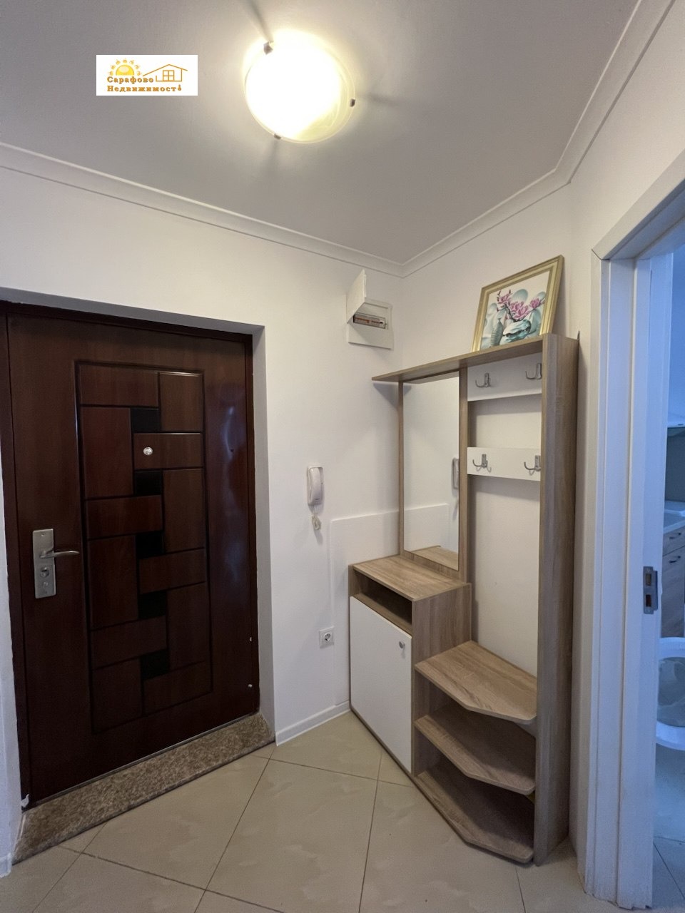 Двустаен апартамент под наем, разположен на партерен етаж, с площ от 55 кв.м. Състои се от дневна с кухня, спалня, тераса, антре, баня и тоалетна. Апартаментът е обзаведен и оборудван и се отдава за дългосрочен наем. Намира се в старата част на Сарафово, в близост до парка, спирки на градския транспорт, учебни заведения.