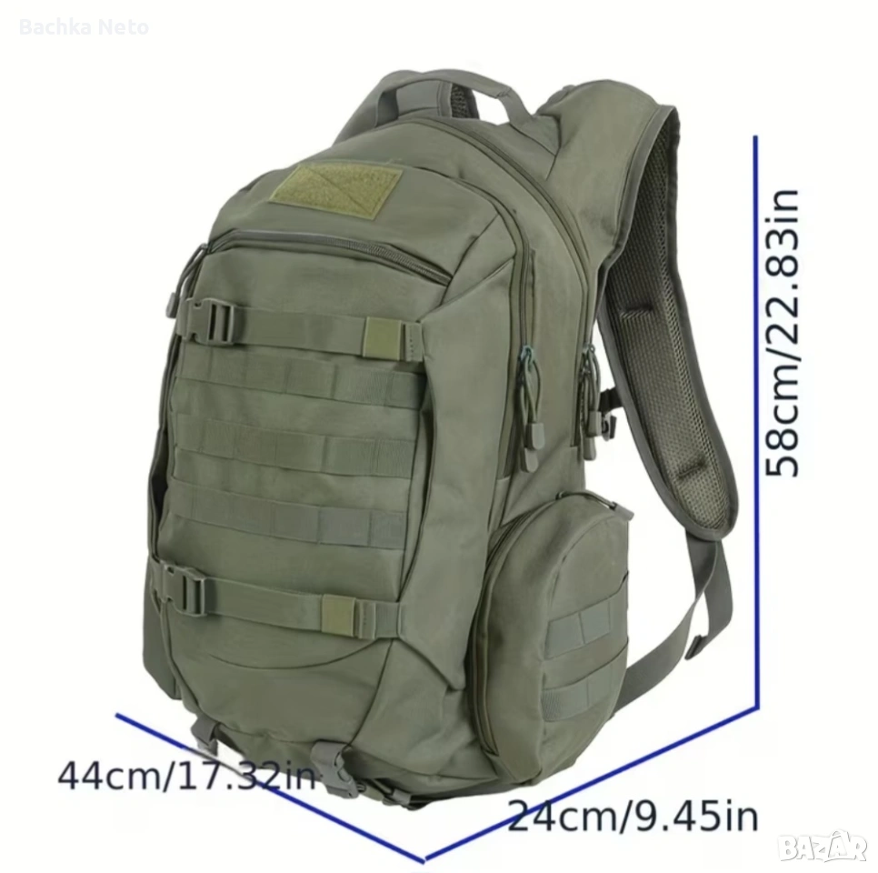 Тактическа раница с molle система, място за велкро патч/нашивка, вътрешен джоб за хидро балон и множество джобове. Иновативният дизайн на раницата дава възможност за голям вътрешен капацитет, както и външен (прикрепване чрез ремъци, или допълнителни molle артикули).
