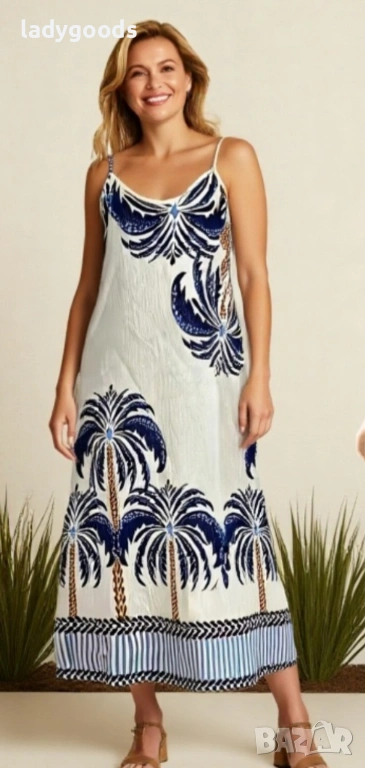 Дамска плажна рокля, от лен и вискоза, идеален избор за жени, които търсят комфорт, свобода на движение и впечатляваща лятна визия. Моделът е с широк, свободен силует, стои красиво и не прилепва по тялото. Това я прави изключително подходяща, за горещите дни и носене върху бански.