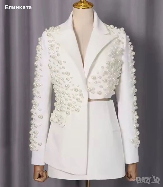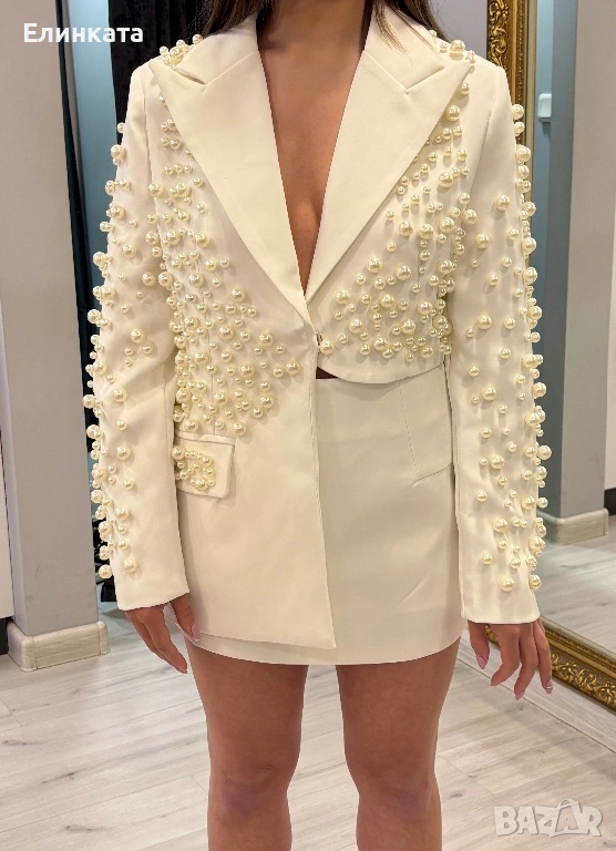 Нов комплект костюм с пайети, бял. Закупен за 297€ от магазин в Пловдив. Чисто нов с етикет. За повече снимки за лично съобщение. З