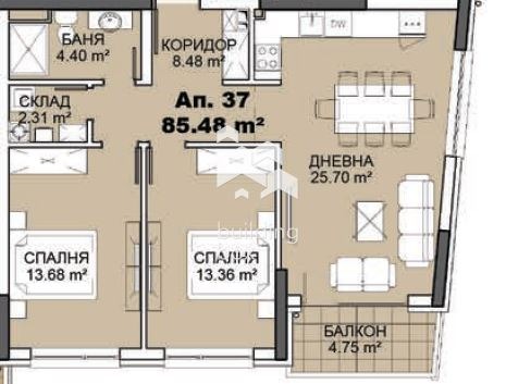 Имотът е с много добро разпределение, със застроена площ от 85.48 кв.м. Състои се от дневна с кухненски бокс, 2 спални, баня с тоалетна, тераса, склад и коридор. Изложението на апартамента е юг-изток. Сградата ще се отоплява на газ и климатици.