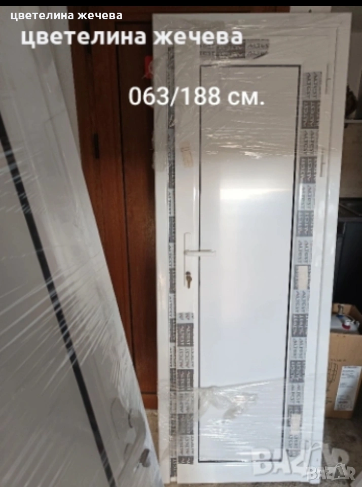 Алуминиева врата с каса,габаритен размер 063/188 см.С отворена каса/без праг/.С перо перваз 5 см.Отваране навънка на дясно или навътре на ляво.