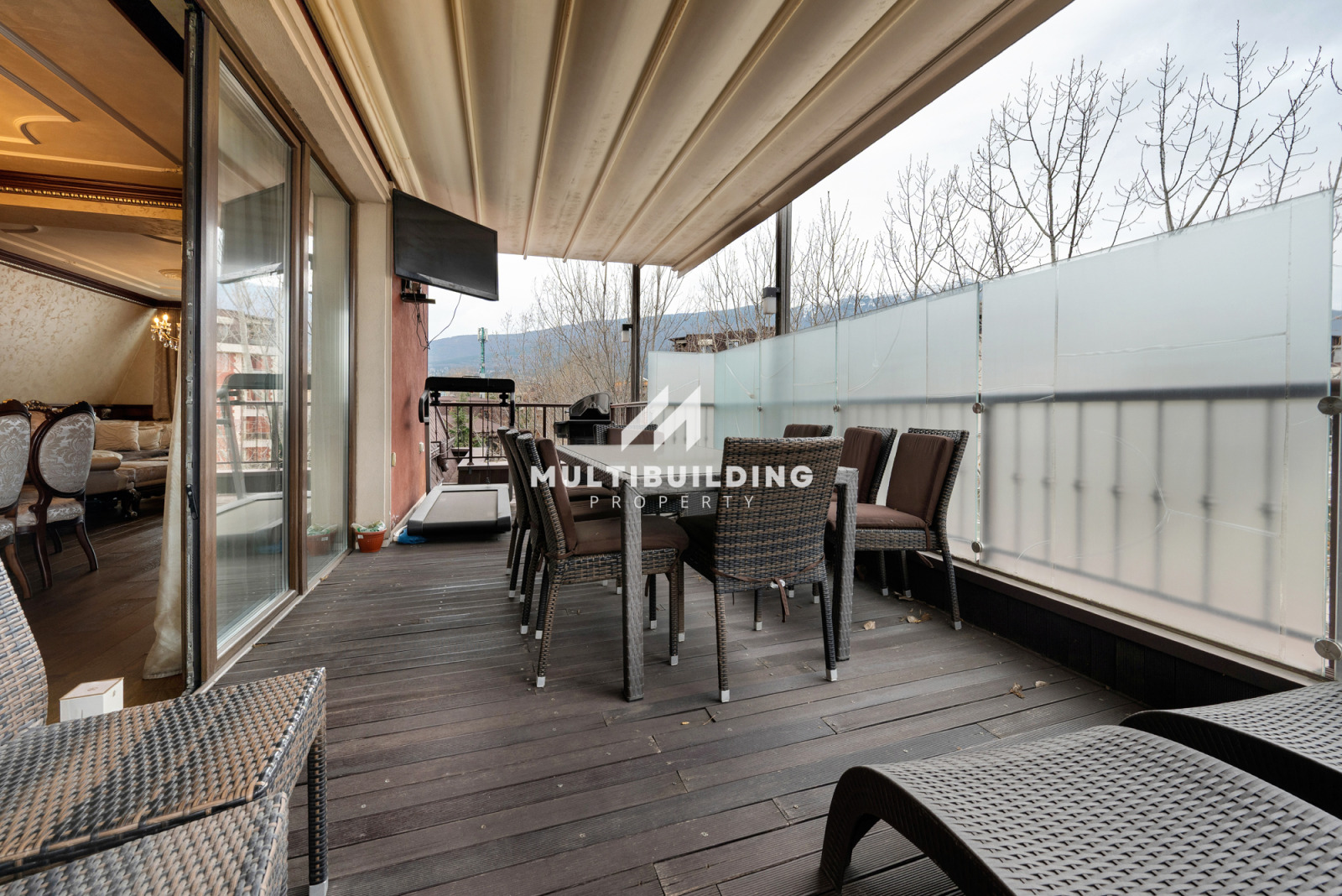 Прилежащата тераса, оборудвана с барбекю и зона за релакс, обикаля целия апартамент.