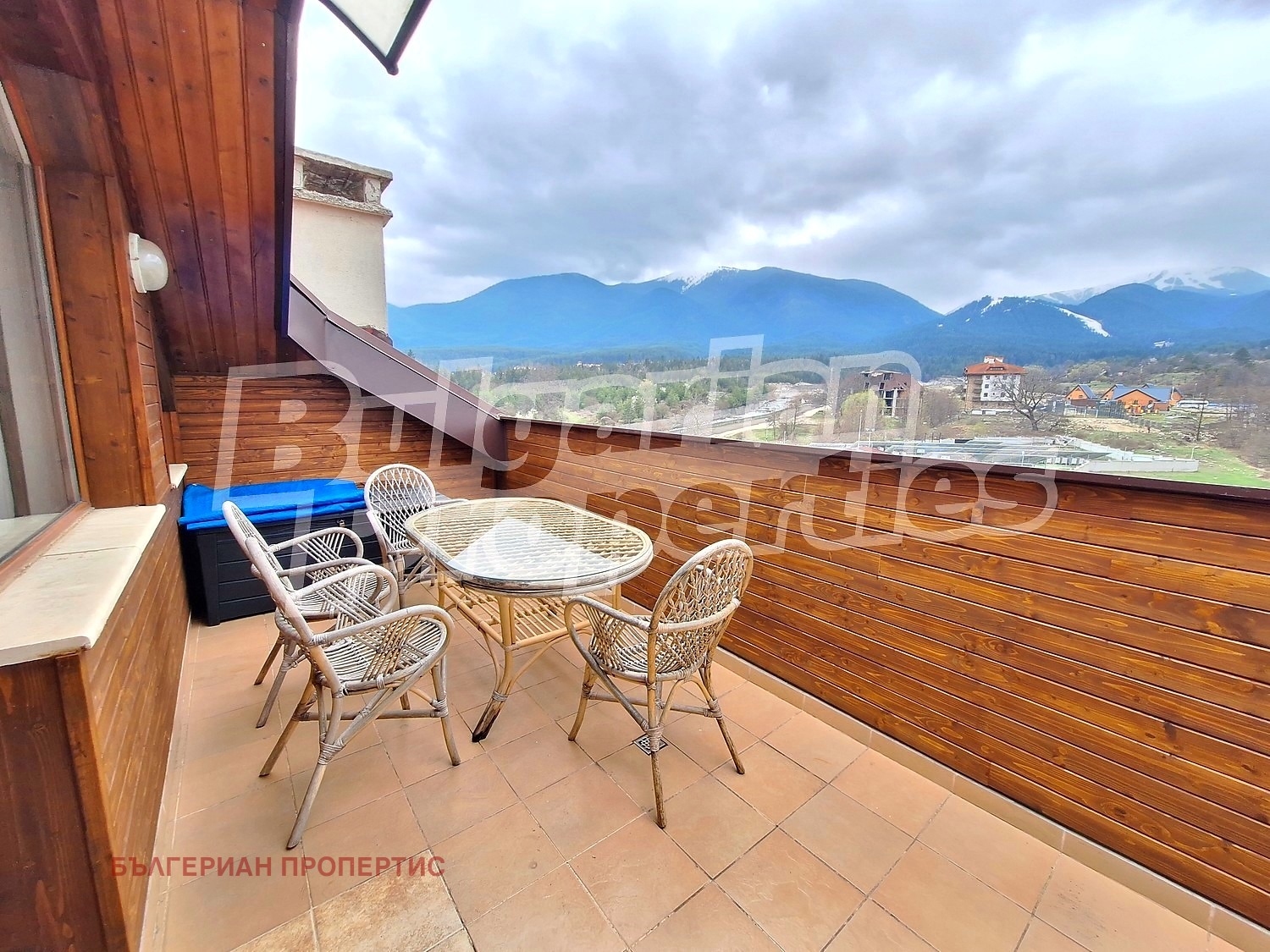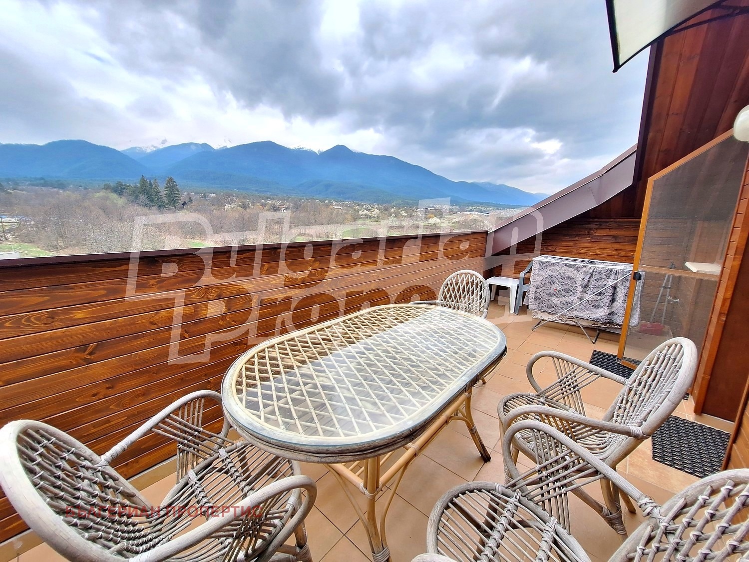 балкон с красива гледка към Пирин и външния басейн на комплекса