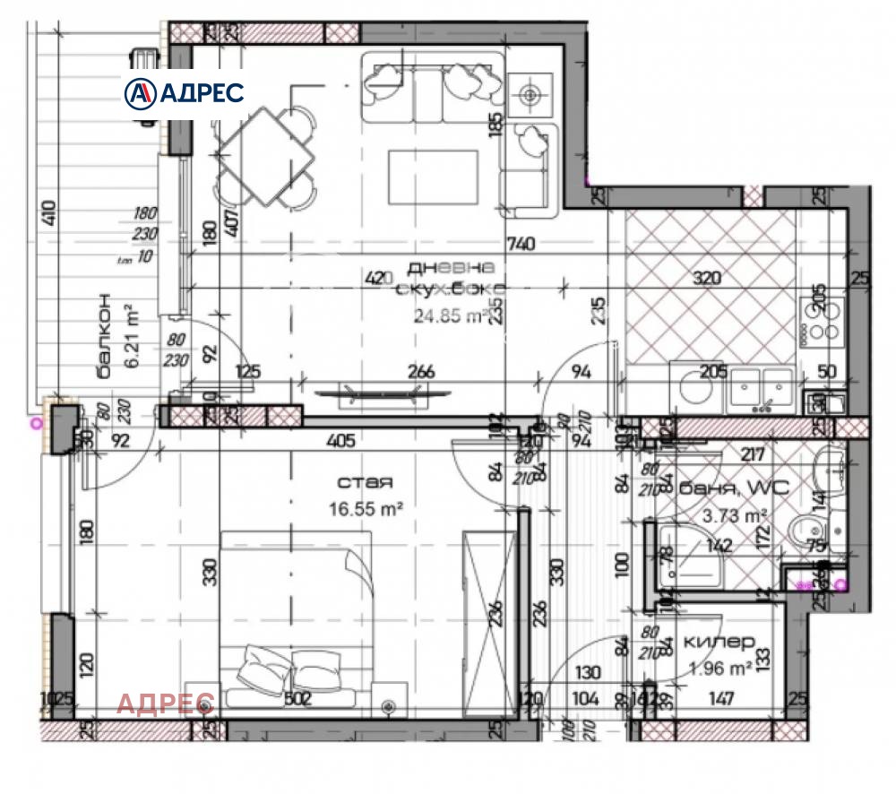 Двустаен апартамент със площ 83 кв.м. Западно изложение. Разполага с антре, дневна с кухненски бокс 25 кв.м, спалня 17 кв.м, баня с тоалет, килер, балкон.