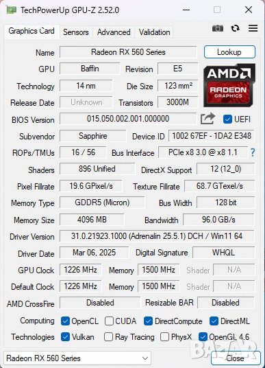 6. VGA - Sapphire Pulse Radeon RX 560, 4 Gb DDR5, 128 Bit - 40 евро