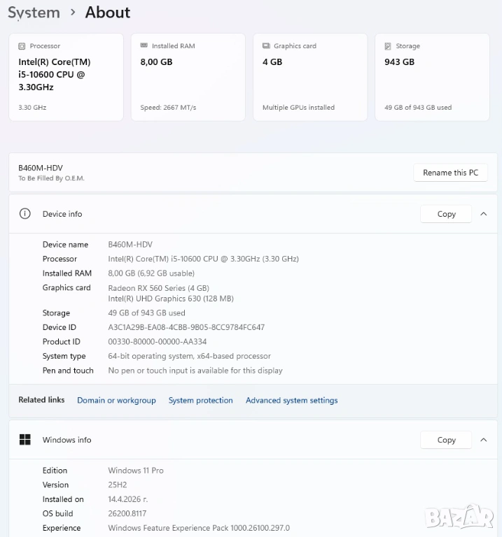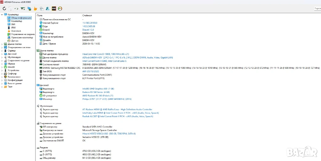 Компютър B460, I5-10600, RX 560, SSD - 330 евро