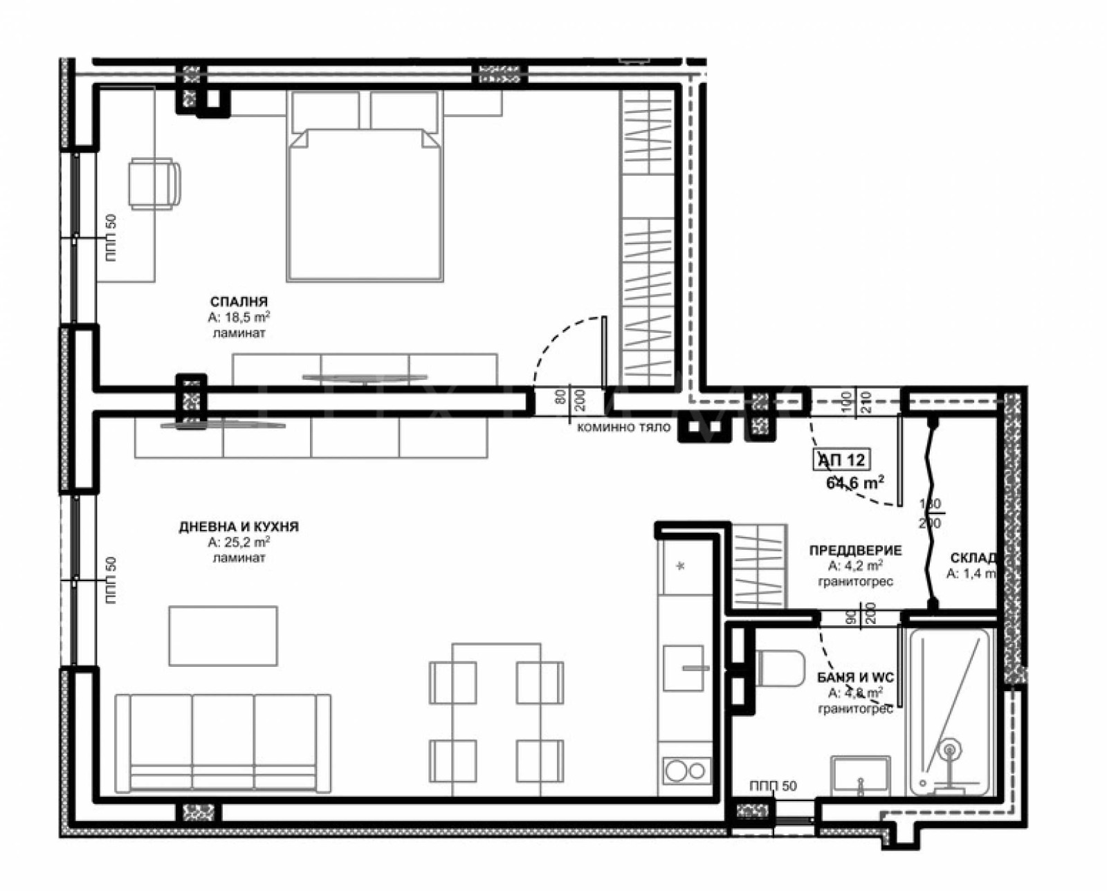 Имотът е с площ от 76,06 кв.м, ситуиран на 2-ри етаж и се състои от: антре, дневна с кухня, спалня, склад, баня с тоалет.