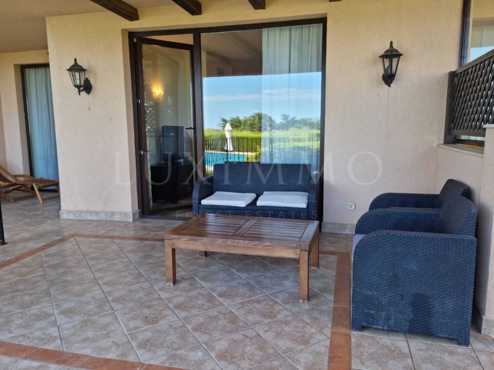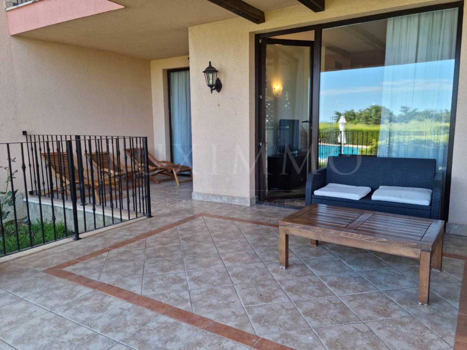 голяма веранда с директен достъп до басейна и излаз от всекидневната или матър спалнята.