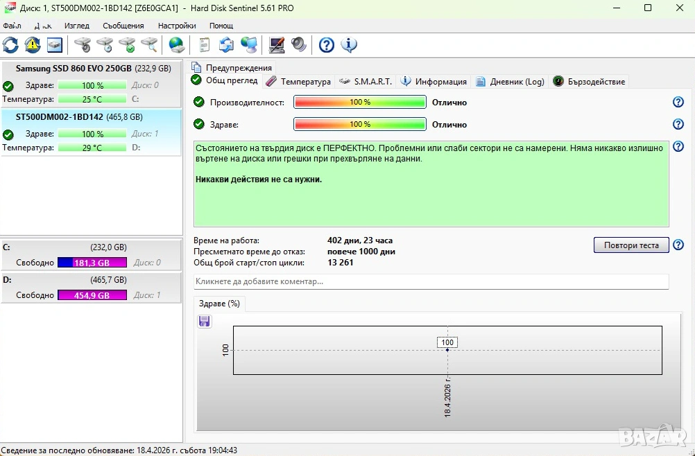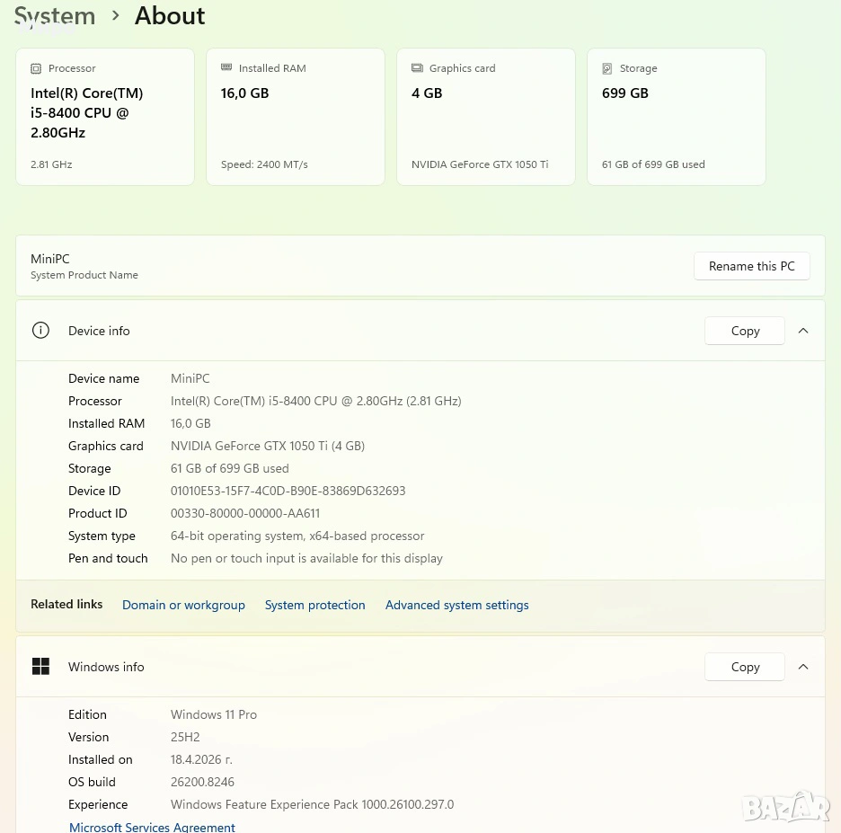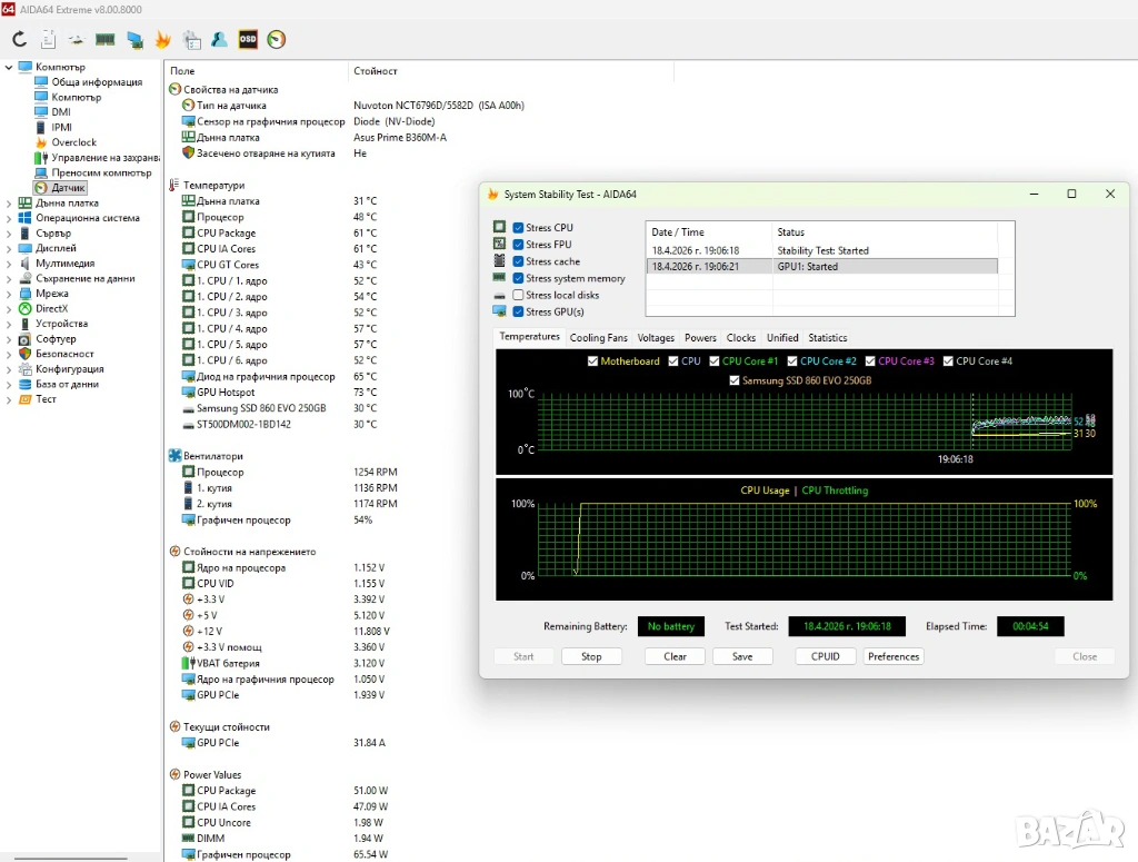 Има инсталиран Windows 11 Pro с всички необходими драйвери и програми за тестването на компонентите.
