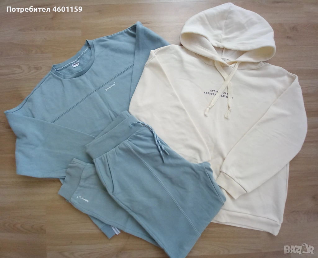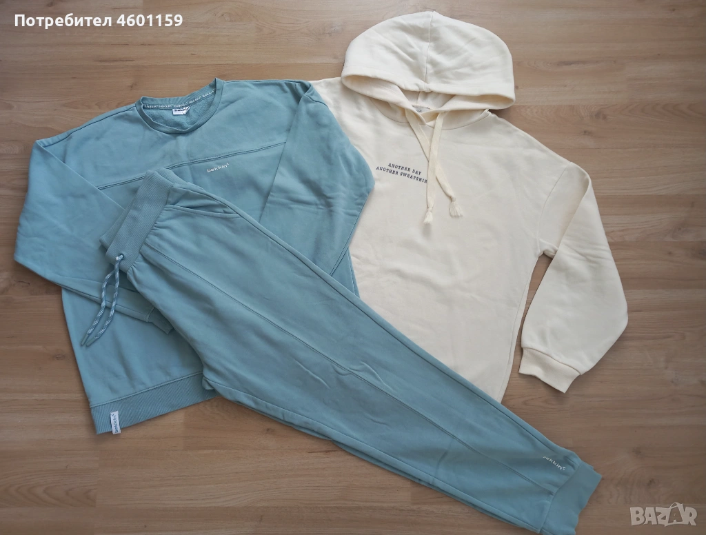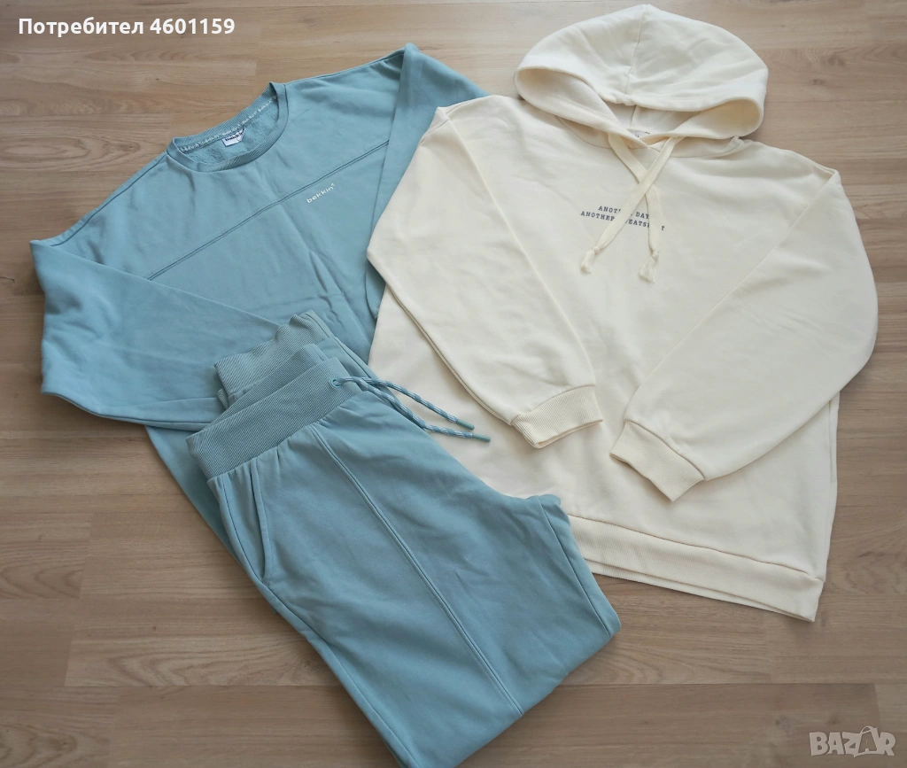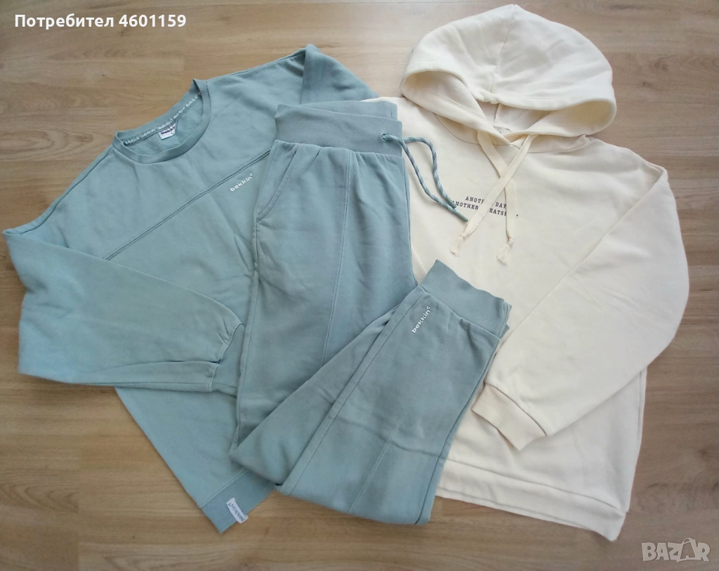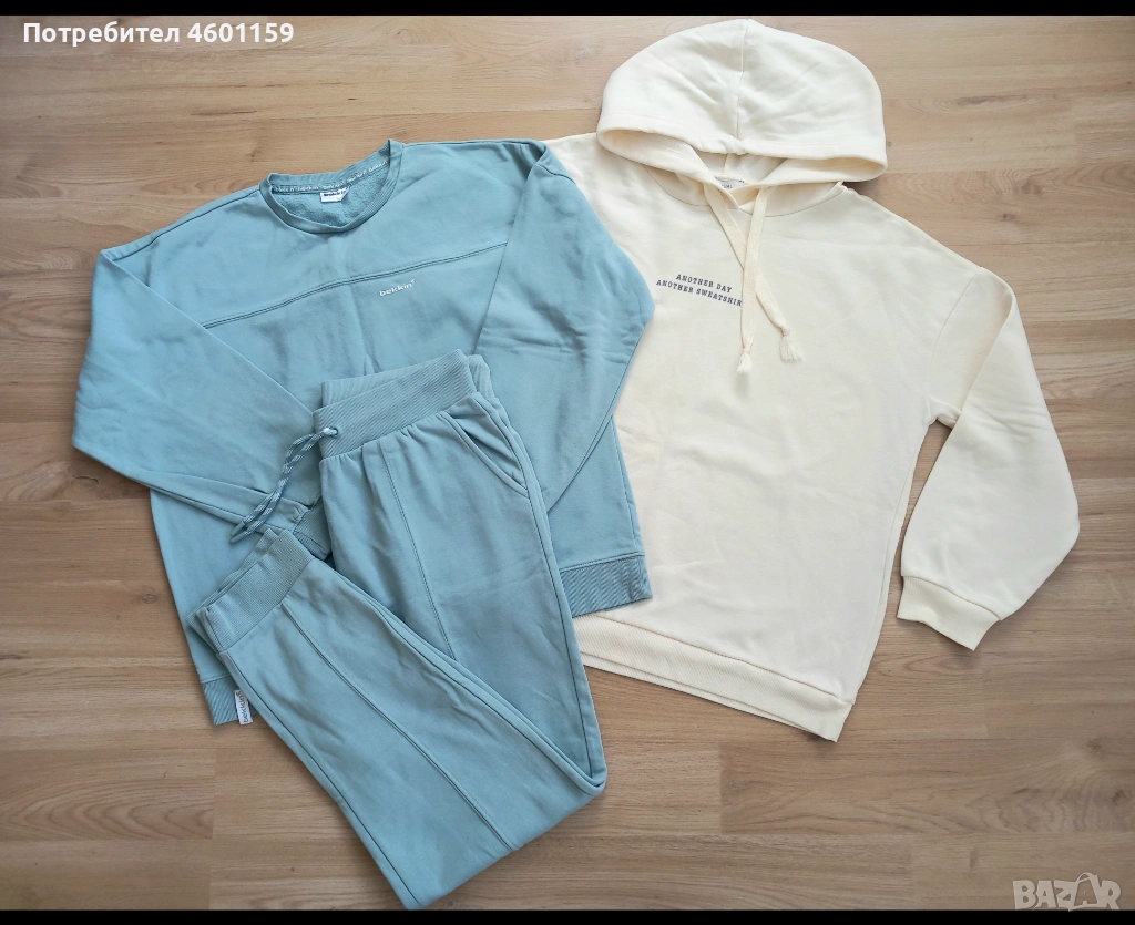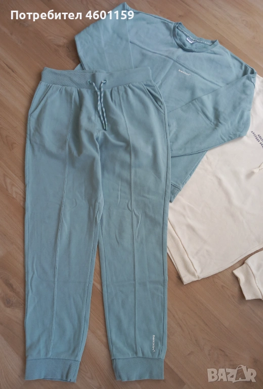 Комплект дамски спортни дрехи в син и бял цвят. Комплекта се състои от два суитчъра и долнище с висока талия. Качествена и мека памучна материя, леко ватирани във вътрешната част. Подходящи за размер L/XL.В отлично състояние, еднократно използвани, чисти