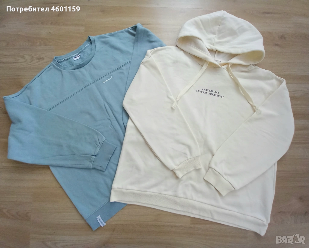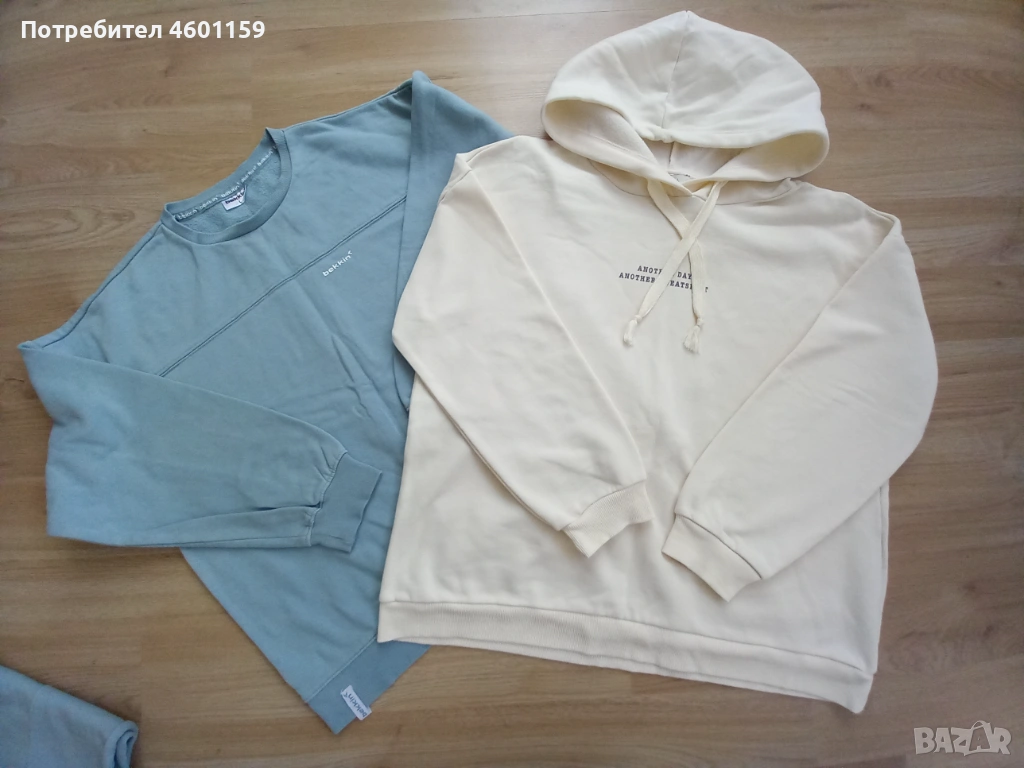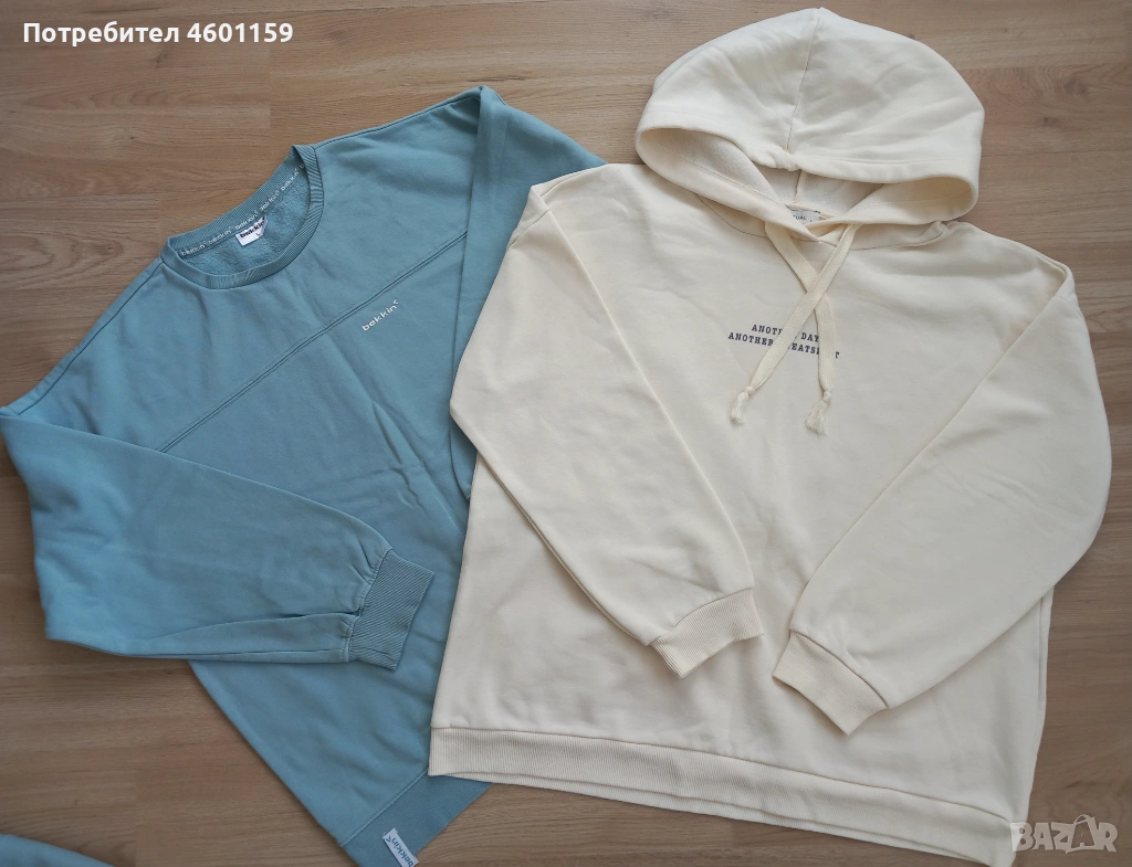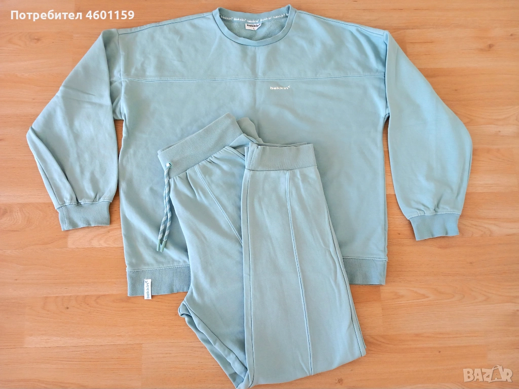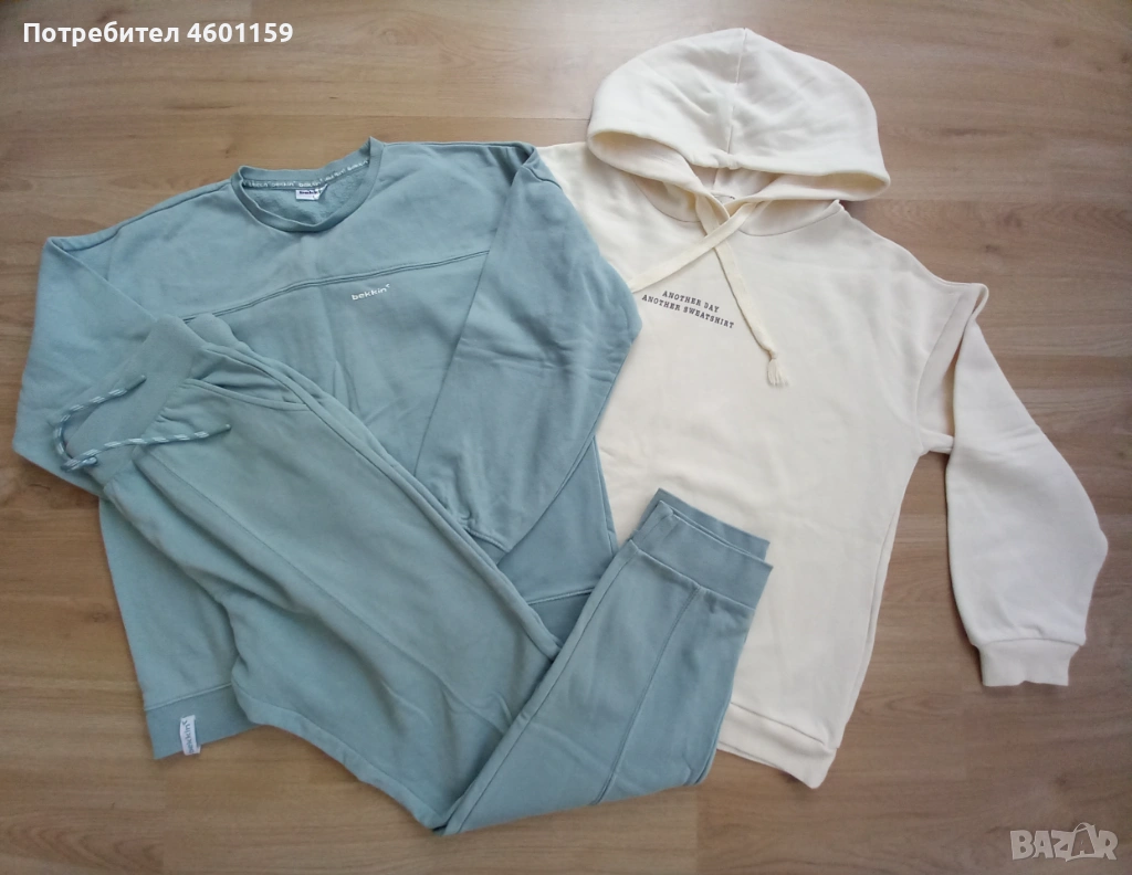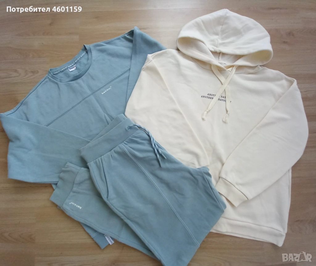 Комплект дамски спортни дрехи в син и бял цвят. Комплекта се състои от два суитчъра и долнище с висока талия. Качествена и мека памучна материя, леко ватирани във вътрешната част. Подходящи за размер L/XL.В отлично състояние, еднократно използвани, чисти