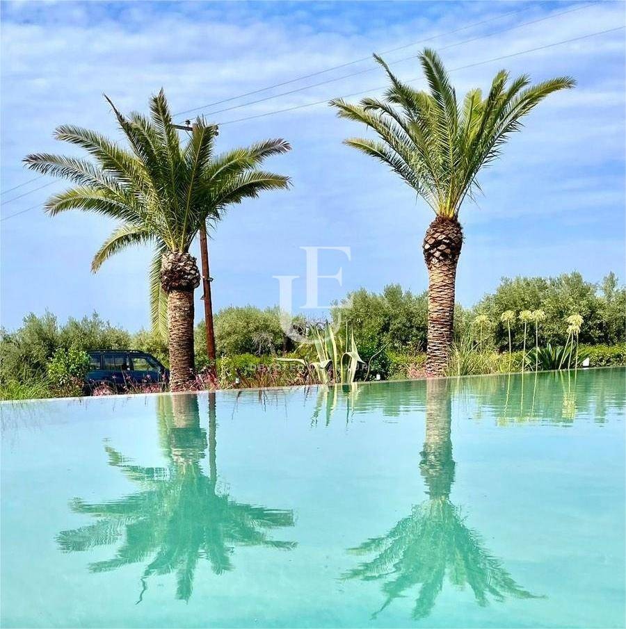 Къщата впечатлява с модерна архитектура, висок клас изпълнение и стилно, напълно обзаведен интериор, готов за незабавно ползване. Разположена върху просторен парцел от 5 900 кв.м, тя предлага усещане за свобода и хармония, допълнени от богато озеленен двор с над 30 стари маслинови дървета източник на собствено производство на висококачествен зехтин. Палмови дървета, внесени от Испания, създават автентична средиземноморска атмосфера и завършват усещането за луксозен начин на живот.