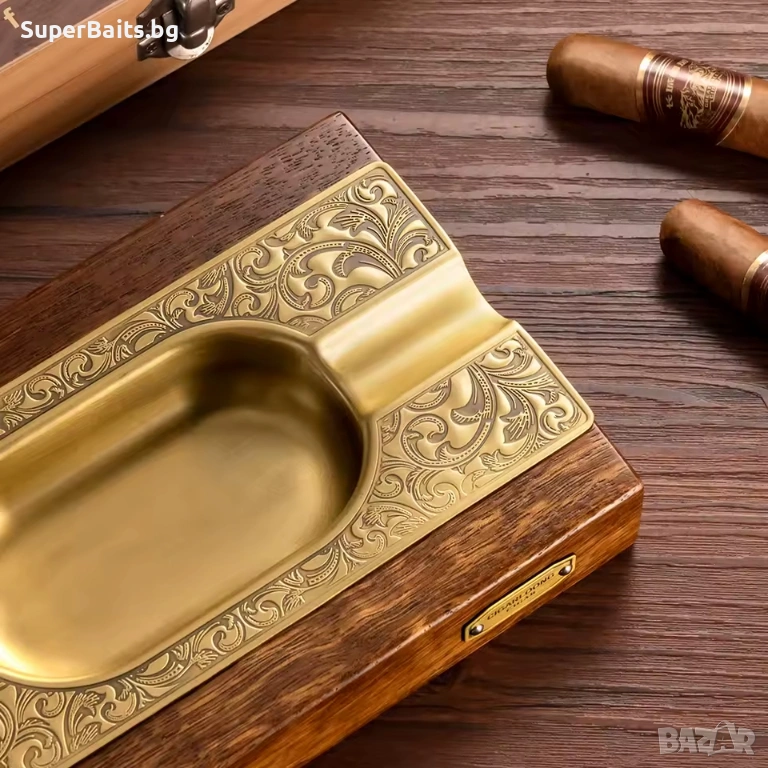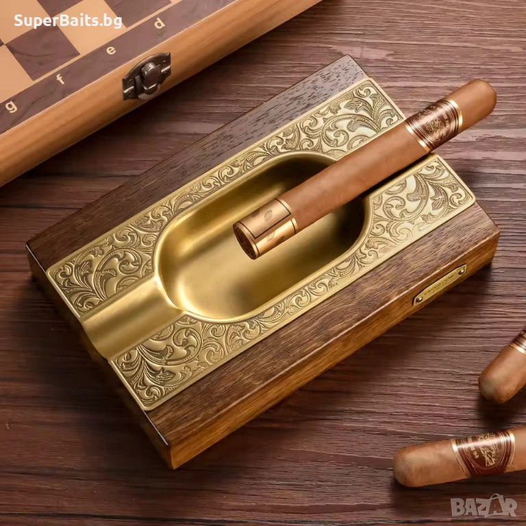 Много качествена изработка - фрезован МЕСИНГ, с основа от маслирано ЕСТЕСТВЕНО ДЪРВО и гнезда за 2 големи пури.