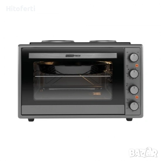 70 литрова мини фурна, таймер и термостат, мощност на фурната – 2000 W, 0+5 функции, биметален термостат, нагревателен елемент тип M (отгоре и отдолу), емайлирана вътрешна кухина (ляв-десен-горен-долен панел), щепсел от европейски тип, 1 квадратна тава + 1 Cr-Ni решетка, 1 кръгла тава тип U с уплътнение, двойна стъклена врата на фурната, стиропор + кутия, лампа, турбо вентилатор, НАПЪЛНО СИВ, ЧЕТИРИ КОНТРОЛА, ИЗКЛЮЧЕН КОТЛОН (Ако котлонът работи, фурната няма да работи.) 2 КОТЛОНА