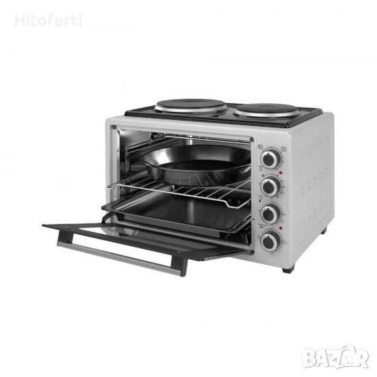 42 литрова мини фурна, таймер и термостат, мощност на фурната – 1400 W 0+3 функции, биметален термостат, нагревателен елемент тип P (отгоре и отдолу), емайлирана вътрешна кухина (ляво-дясно-горе-), метална защита срещу съпротивление, щепсел от европейски тип, 1 квадрат Тава + 1 Cr-Ni решетка, 1 кръгла тава тип запечатване, стиропор + опаковка на кутия, ЦЯЛ СИВ ЦВЯТ