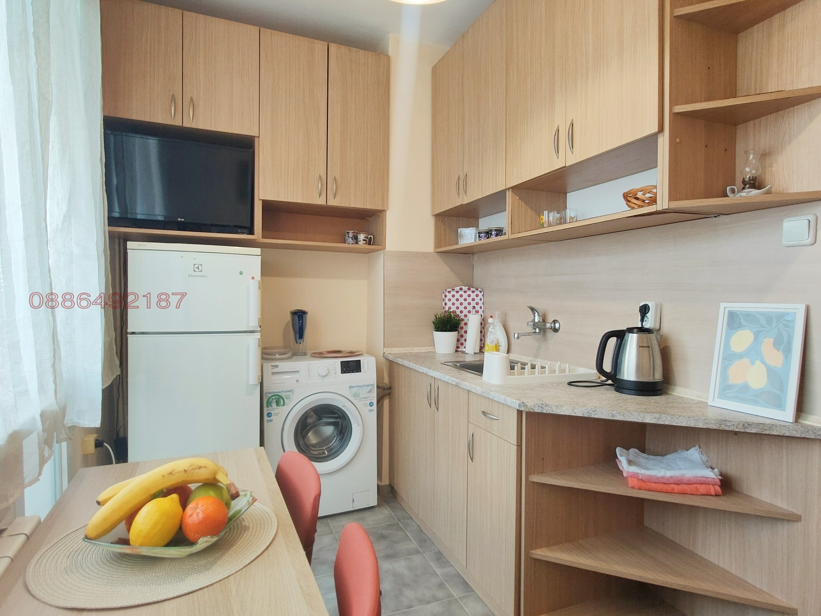 Електроуреди в апартамента - климатик, два телевизора, пералня, хладилник, готварска печка, микровълнова, блендер. През зимата - отопление с централно парно.