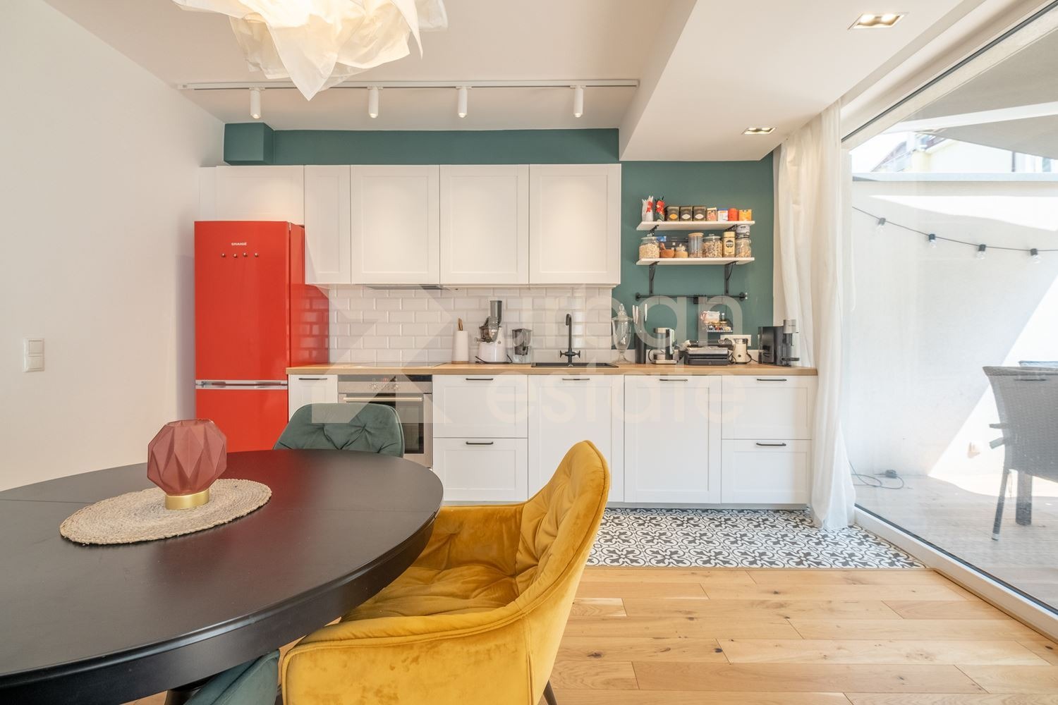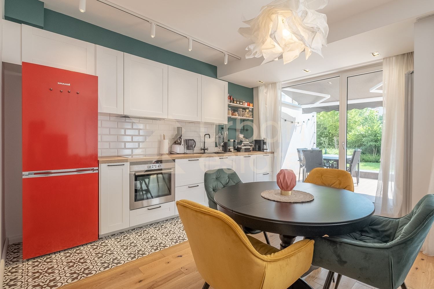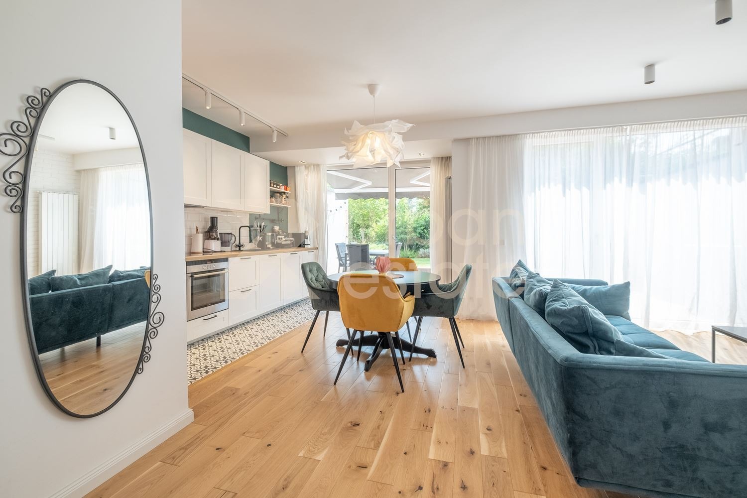 Просторната дневна зона е организирана с внимание към комфорта и естетиката стилна кухня, трапезария и зона за отдих с директен излаз към веранда и прекрасно озеленен собствен двор.