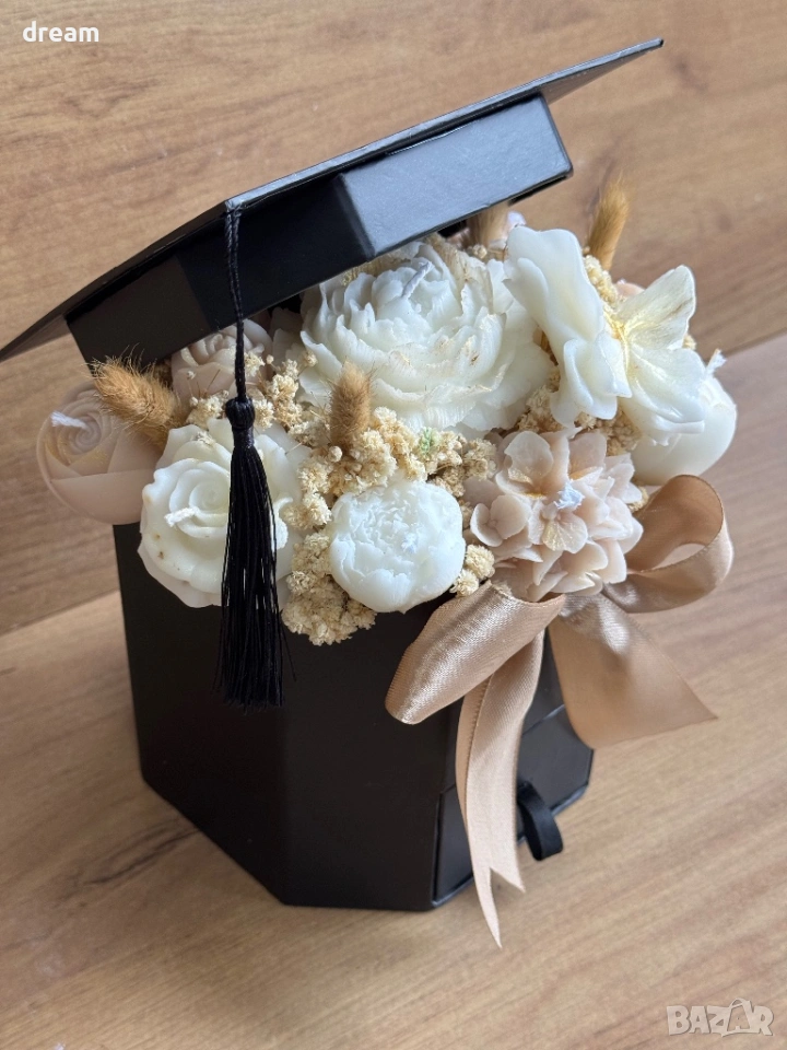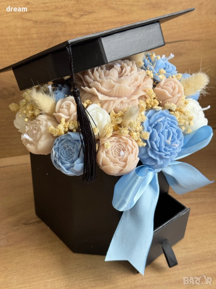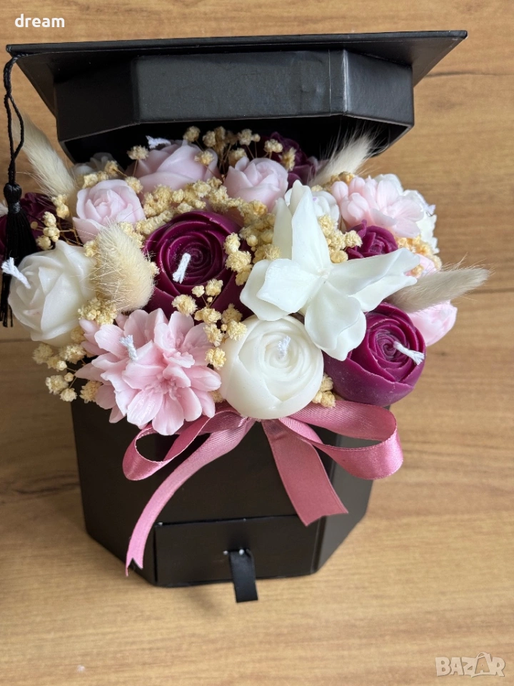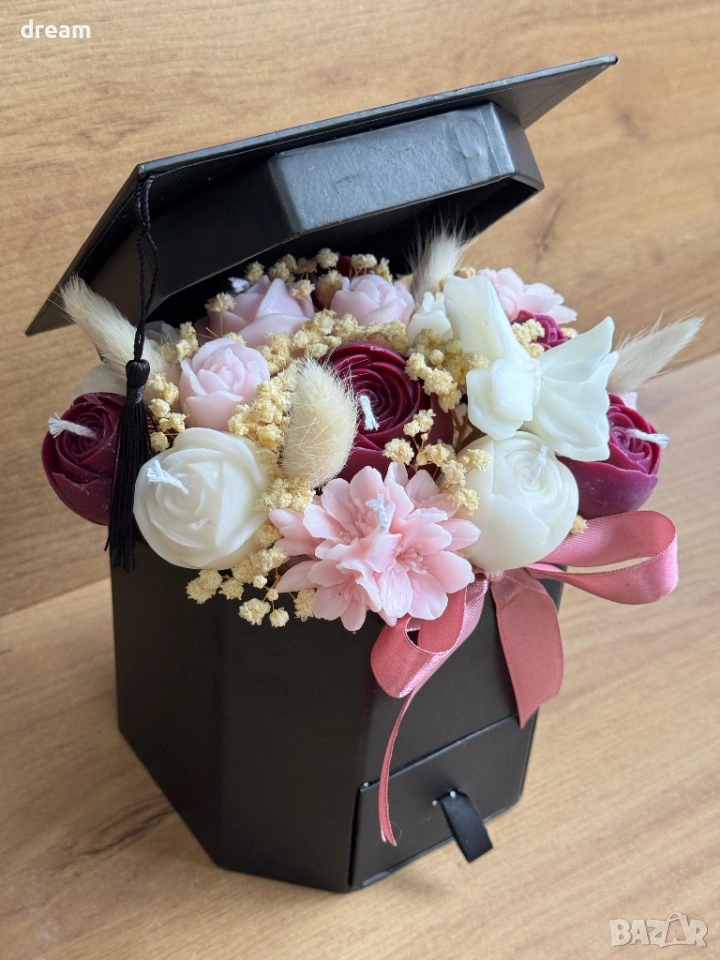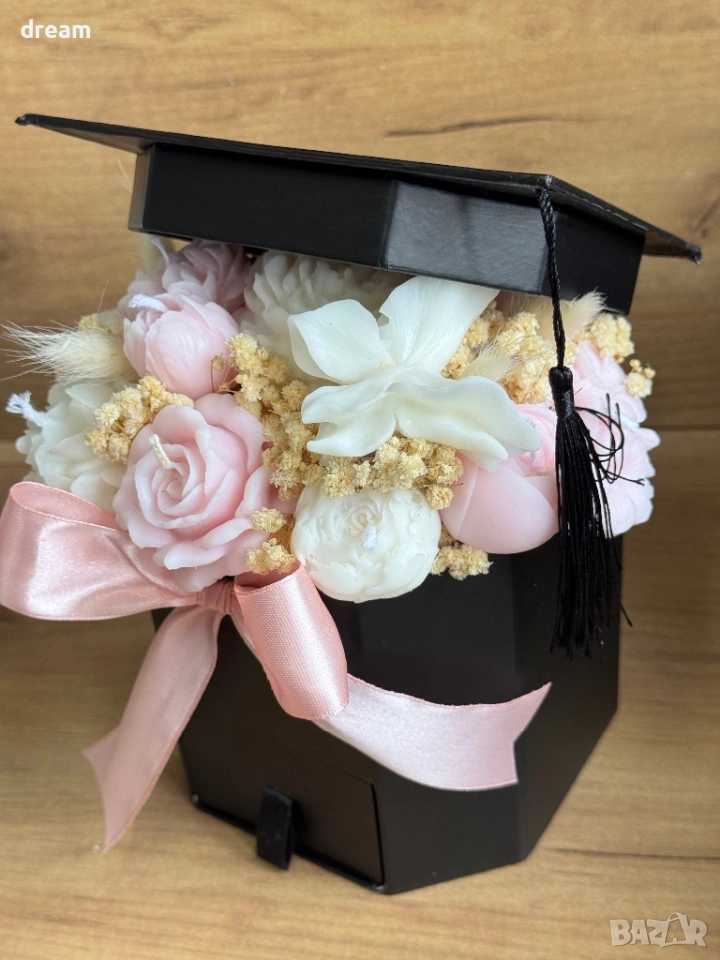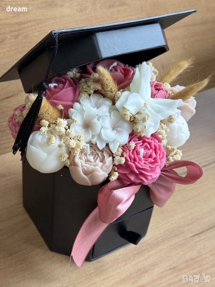 Зарадвайте, любими абитуриенти или абсолвенти с тематичен букет от ароматни соеви свещи, в луксозна кутия с тематична шапка и отделение за паричен подарък или бижу