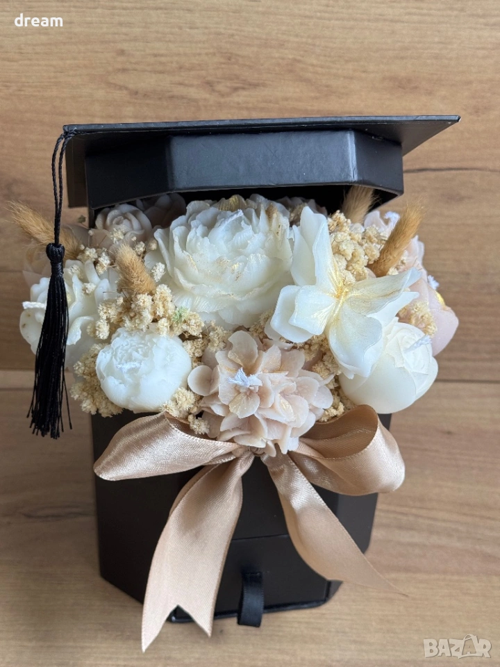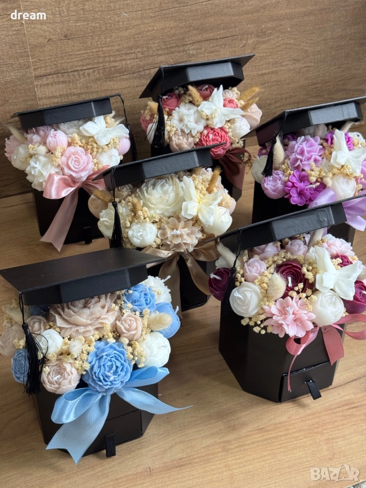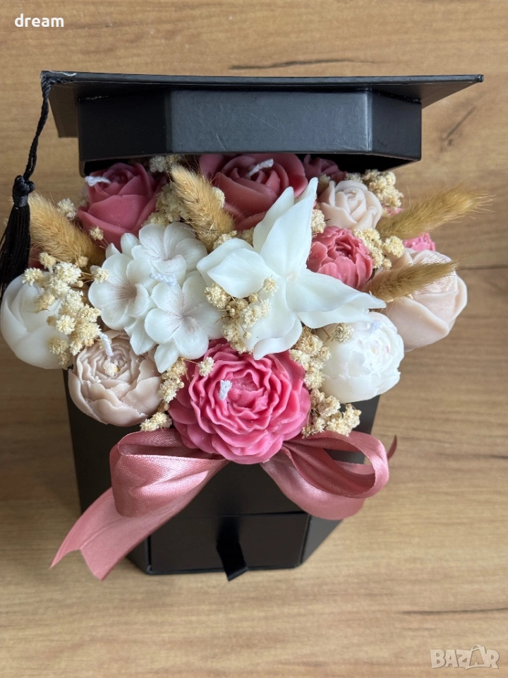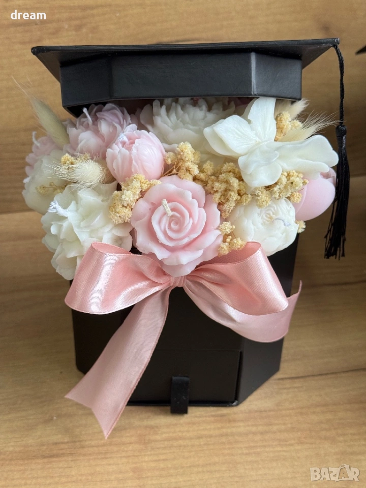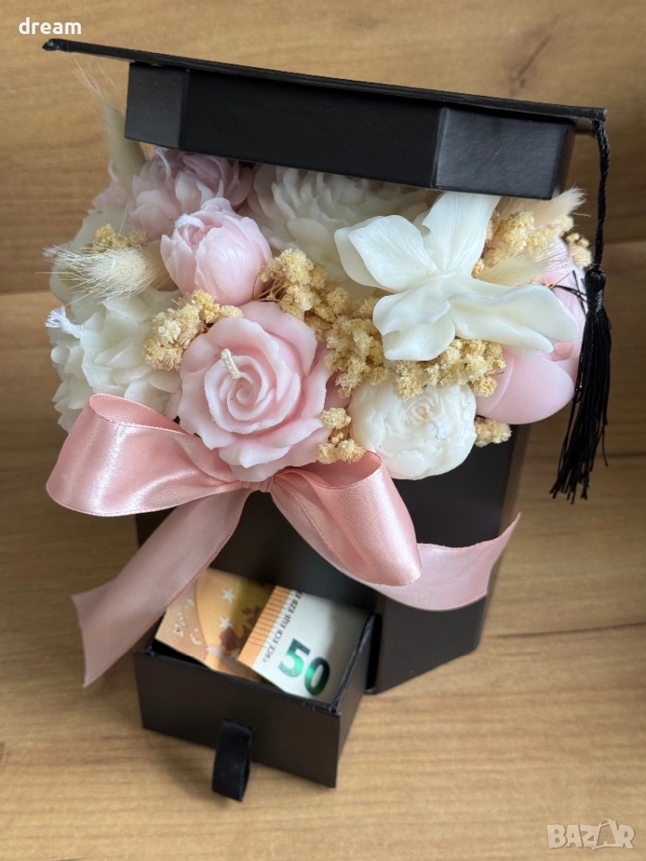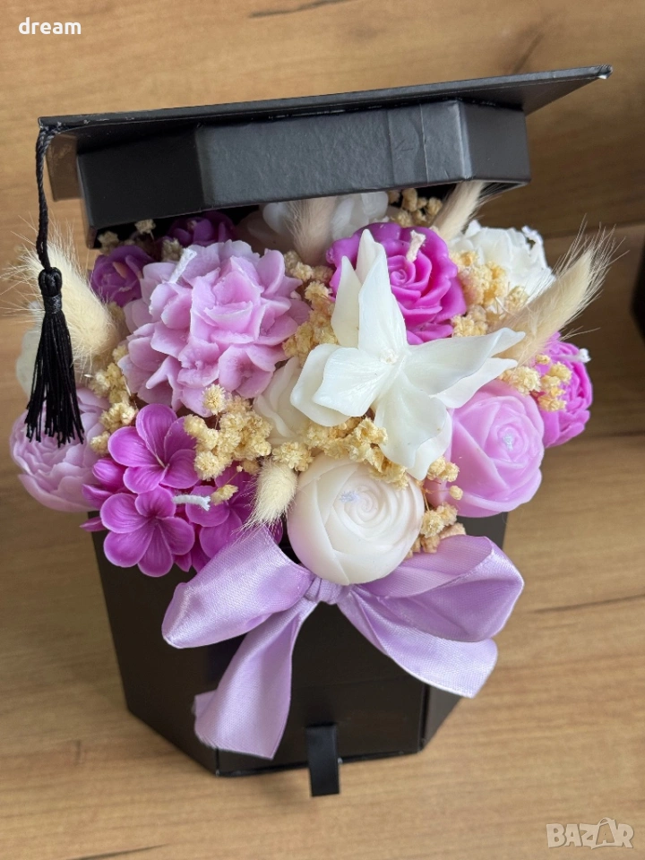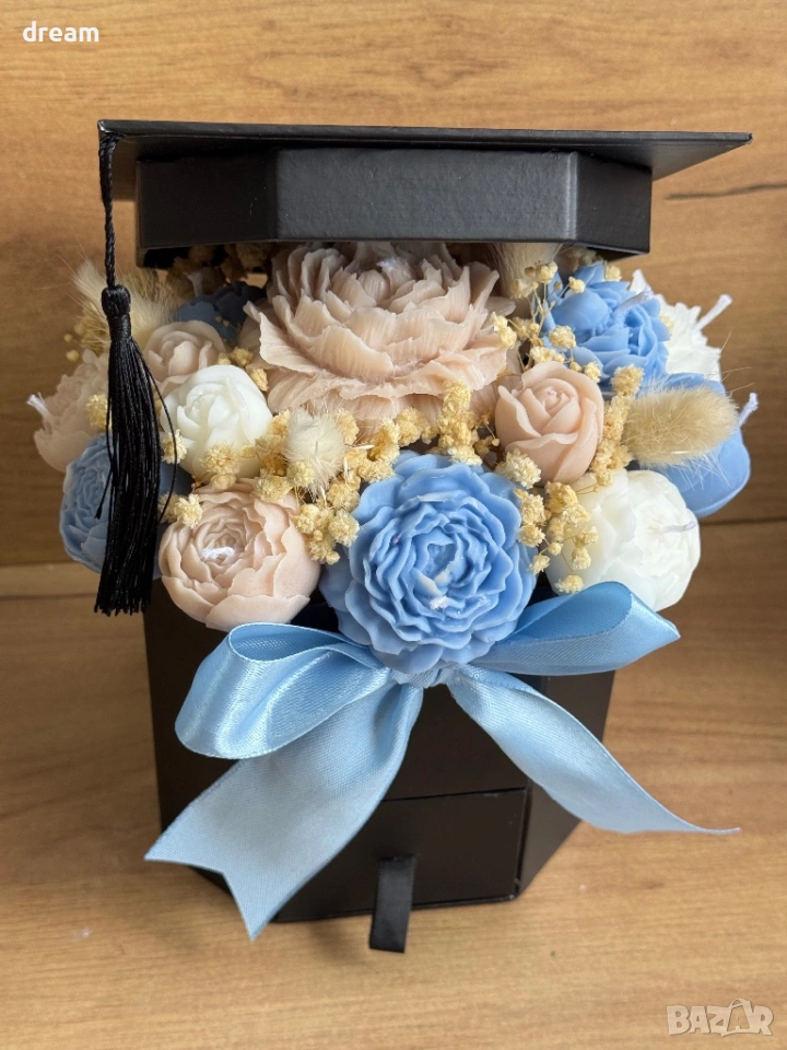 Зарадвайте, любими абитуриенти или абсолвенти с тематичен букет от ароматни соеви свещи, в луксозна кутия с тематична шапка и отделение за паричен подарък или бижу