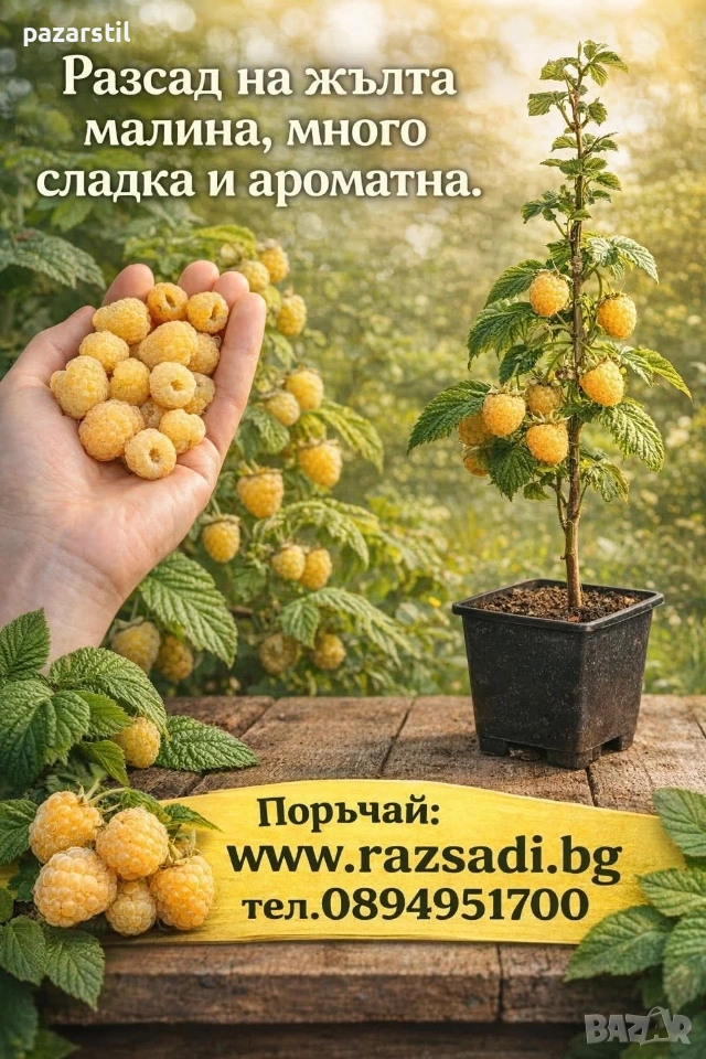 www.razsadi.bg Предлагаме разсад за жълта малина. Жълтата малина е разновидност на обикновената малина, но с плодове в жълт или златист цвят вместо червен. Тя е по-рядко срещана, но много ценена заради вкуса и външния си вид. Цвета на плодовете е от бледожълт до наситено златист. Вкуса е по-сладък и по-малко кисел от червените малини. За това сорта е подходящ за хора с чувствителен стомах. Аромата е лек и фин. Текстурата сочна и нежна. Жълтите малини се отглеждат почти по същия начин като червените: Обичат слънчеви места, нуждаят се от добре дренирана почва, изискват редовно поливане. Режат се всяка година за по-добра реколта. Оглеждат се много добре както в градина, така и в саксия, стига да са им осигурени правилни условия: Саксия та да е с обем минимум 20–30 литра и дълбочина поне 30–40 см.( Сорта расте бързо, за това избирайте по голям съд, задължително с дренажни отвори). Почвата трябва да е лека и добре дренирана (смес от градинска почва + торф + перлит). Може да се добави компост. Растението обича слънце (поне 6–8 часа на ден). Може да се развива и на полусянка, но ще дава по-малко плодове. Почвата трябва да е влажна, но не подгизнала. В саксия, почвата изсъхва по-бързо, за това се препоръчва по-често поливане, особено през лятото. След плододаване, е добре старите издънки да се подрязват и премахват. Това помага за нов растеж и повече плод. Растението е напълно студоустойчиво, но в саксия корените са по-уязвими. За това е необходимо съда до е разположен до стена и зимата да се изолира, като се увие (например с чувал, старо одеало, стиропор или друго). Торене се извършва на всеки 2–3 седмици. Жълтите малини са богати на витамини C и A. Плодовете им съдържат много антиоксиданти. Подпомагат имунната система. Консумират се пресни, в сладка и конфитюри, в десерти (торти, кремове). Използват се и като украса на ястия, салати и десерти. Растенията са вкоренени, засадени в саксия. За цени и поръчки от тук: https://www.razsadi.bg/bg-product-details-90.html или на тел.0894951700