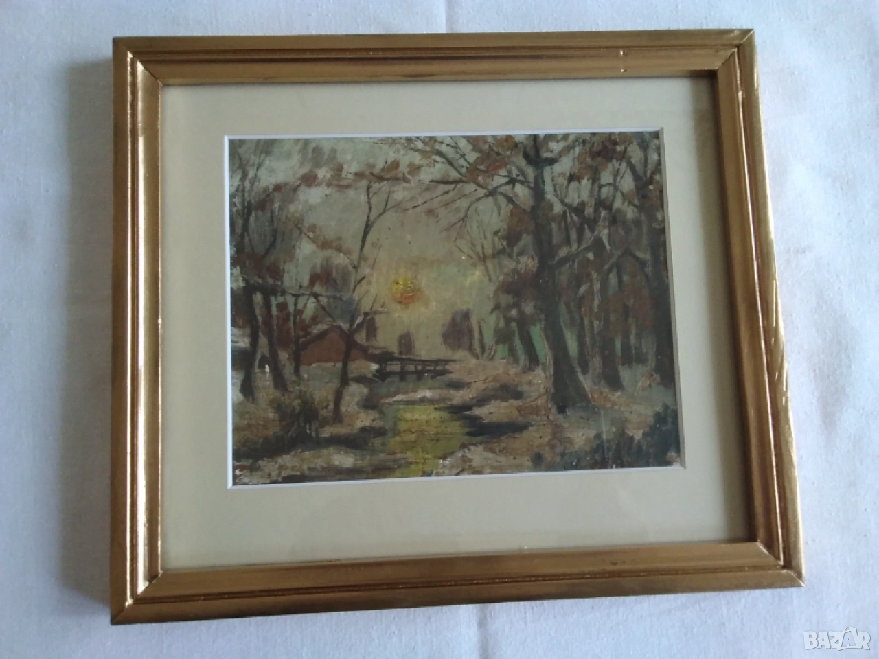 Продавам картина темпера върху картон - Зимен пейзаж от средата на 20 век, неизвестен автор, дървена рамка с паспарту, размери 32/28 см, само картината- 22/18 см. Много добро състояние.