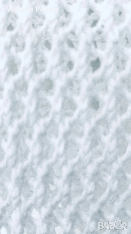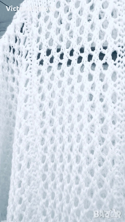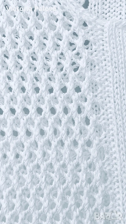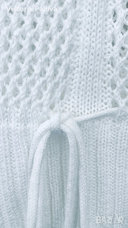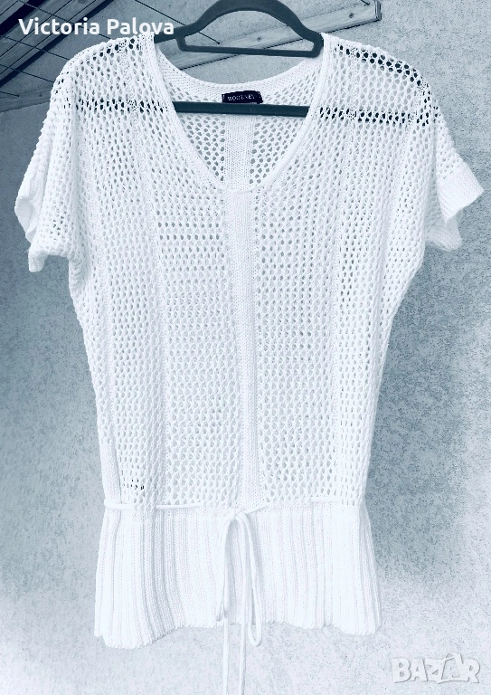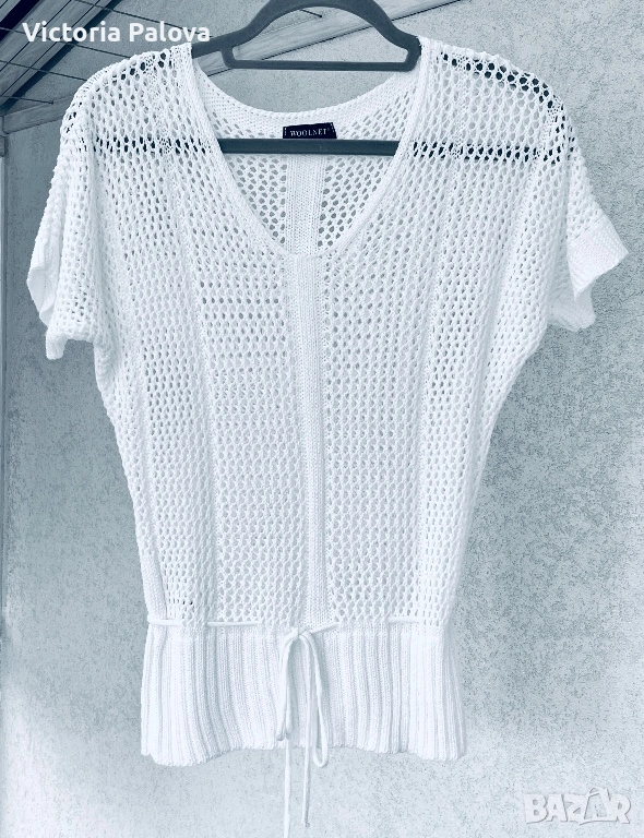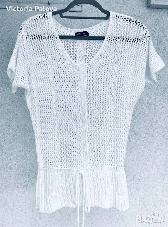 Тази ефирна ажурна блуза е изработена в стил „плетка на една кука“ и се отличава със свободна кройка и елегантно V-образно деколте. Основният акцент на модела е връзката на талията, която позволява лесно регулиране на силуета според предпочитанията. Благодарение на своята мрежеста структура, блузата е изключително проветрива и подходяща за горещите летни дни, като може да се носи както върху базов топ за градска визия, така и като стилно допълнение върху бански костюм. Моделът е с размери: рамо – 77 см, гръдна обиколка (ГО) – 52 см и дължина – 62 см.