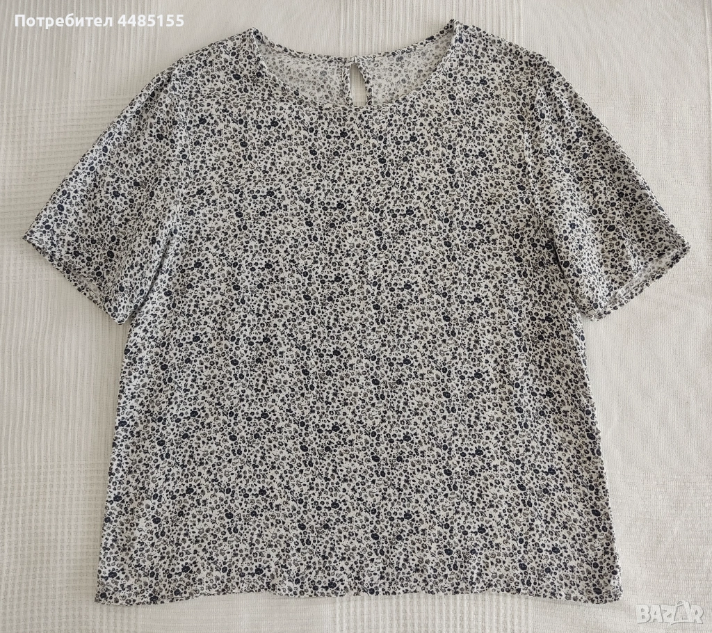 Приятна блуза с къс ръкав и копченце на тила, М/S. Много нежен десен със ситни цветчета на бял фон. В отлично състояние.